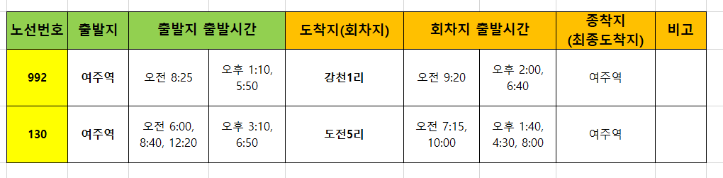 - 여주역 (08:40발) 130 환승(08:44) - 도전2리 하차(09:43)