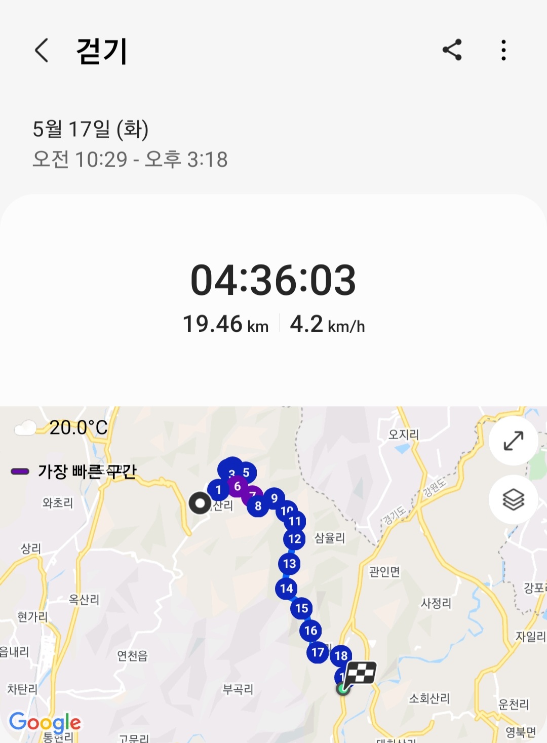 실제 총거리 : 19.46km (갤럭시 워치4 기록. 코스 경로 부실로 헤맴.)