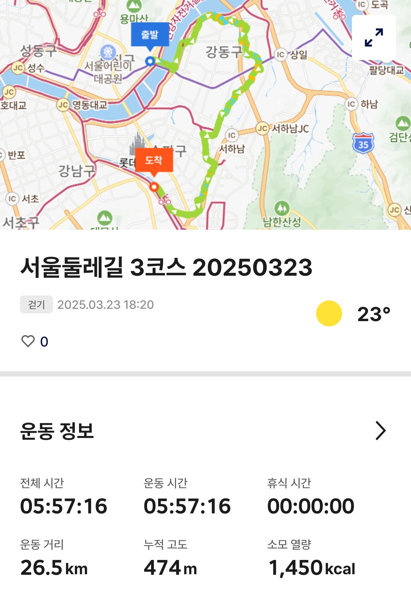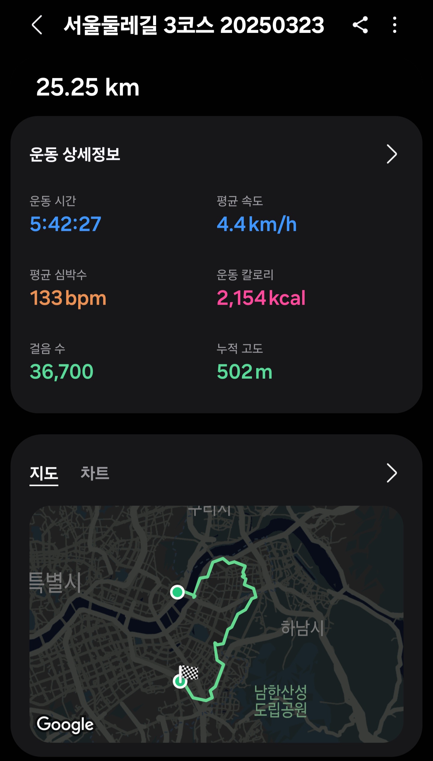 실제 총거리 : 25.25km (갤럭시 워치 기록)