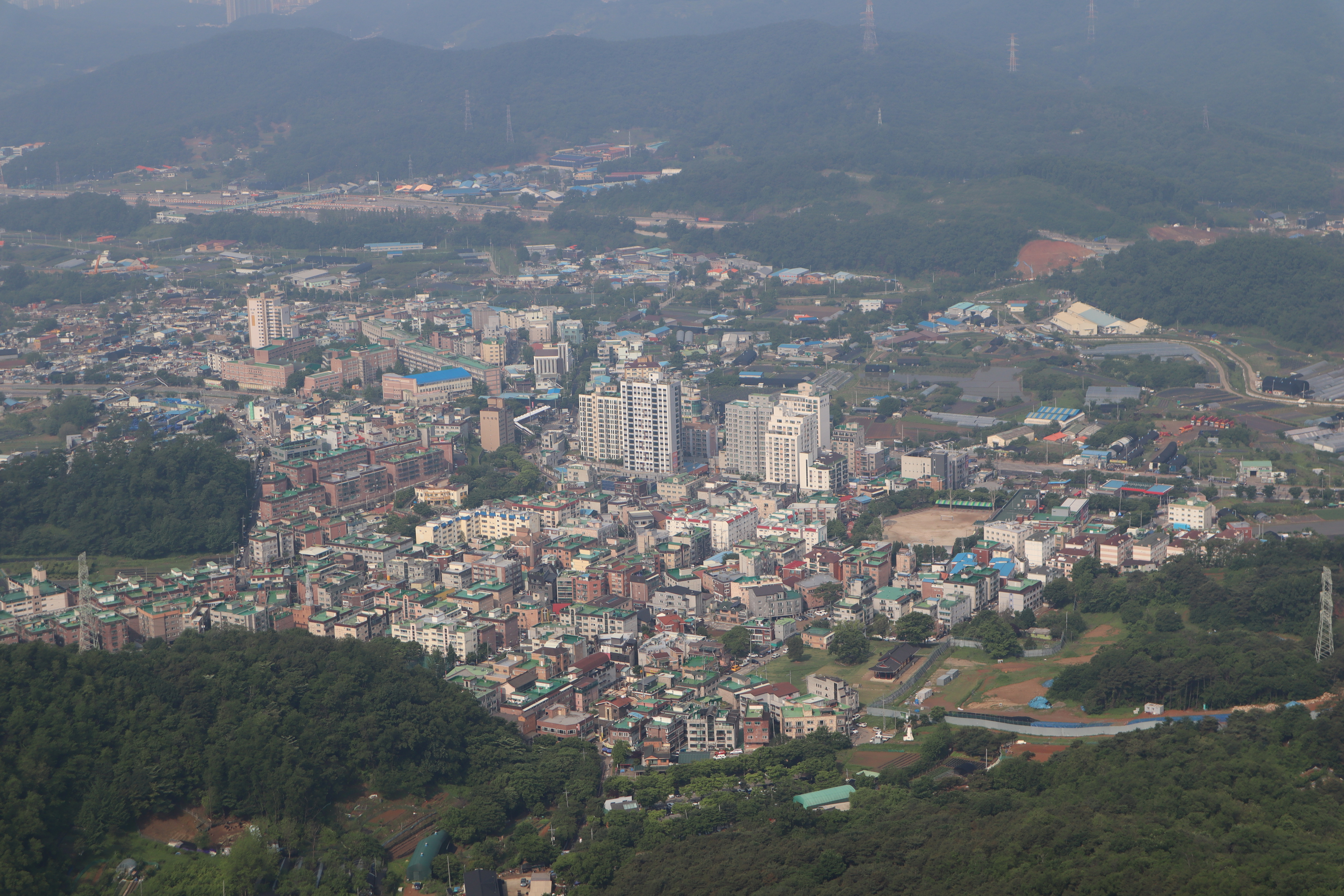 수암봉 전망대 본 수암동. 운동장 보이는 곳이 안산초등학교.