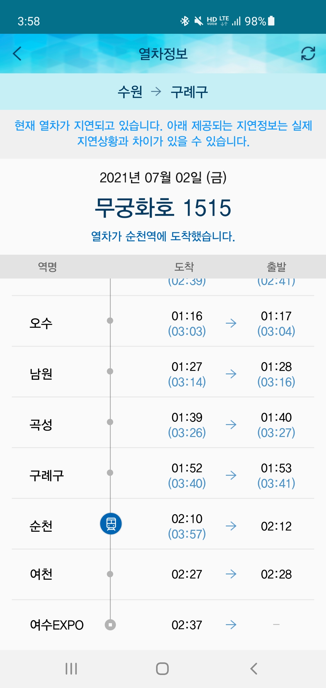 - 구례구역 03시41분 도착. (괜히 기존편 취소함. 1분뒤에 도착하던데.)