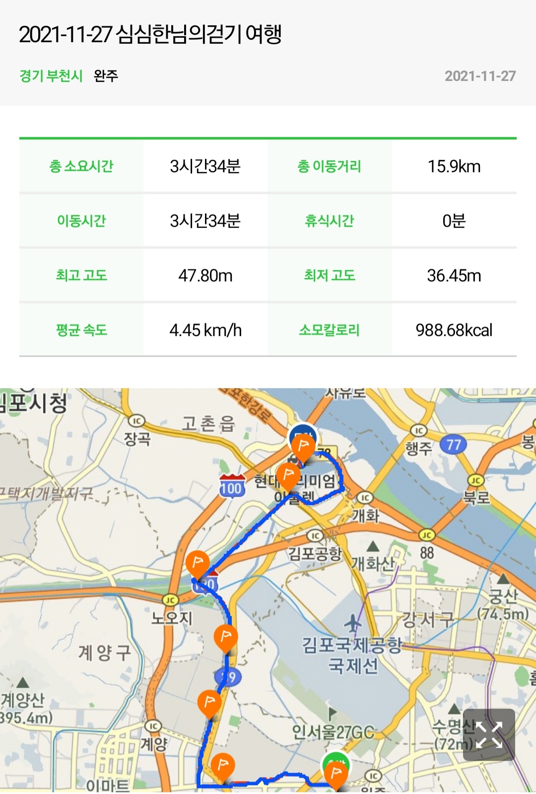 실제 총거리 :  15.89km (갤럭시 워치4 기록)