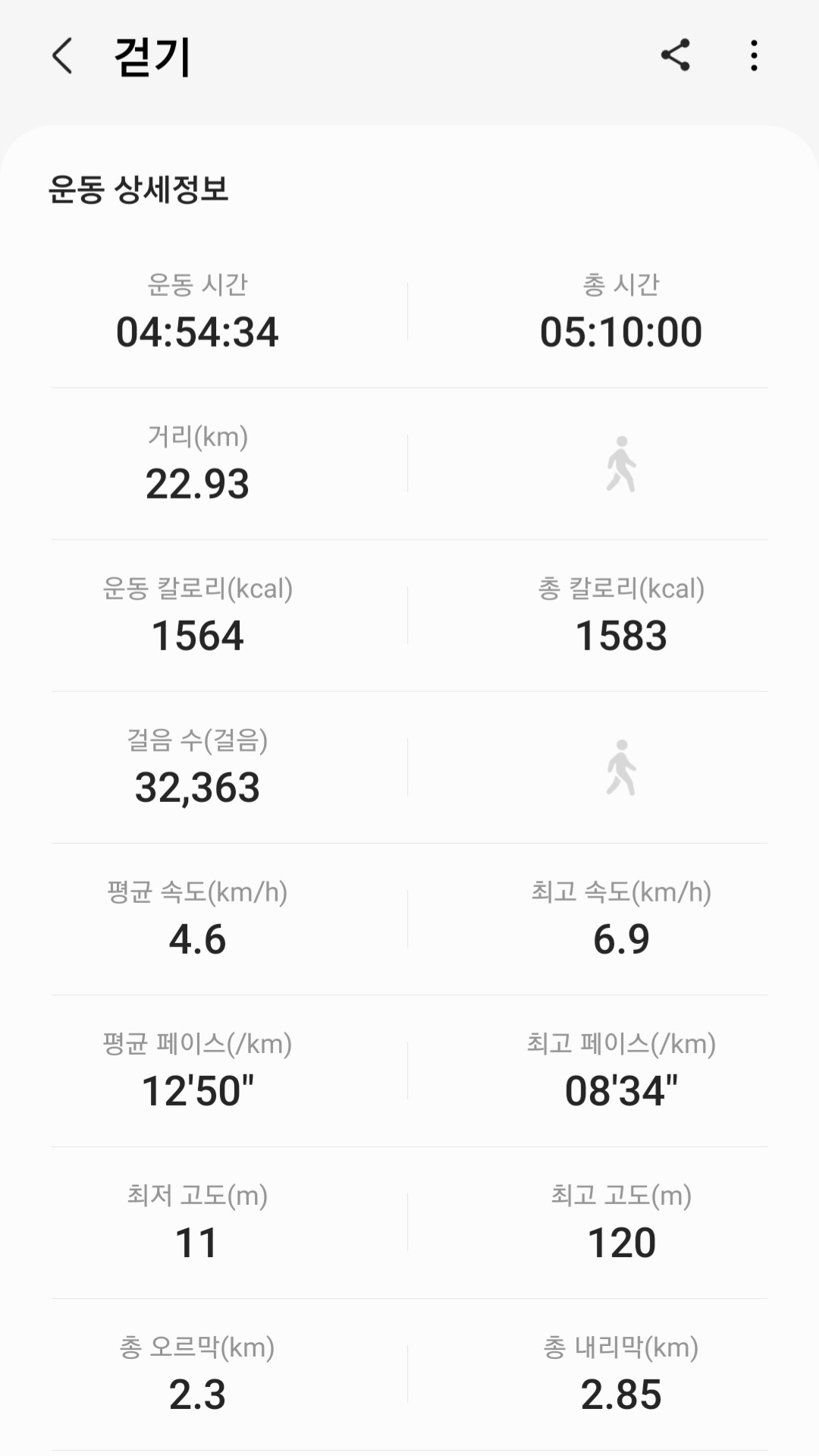 실제 총거리 : 22.93km (갤럭시 워치4 기록)