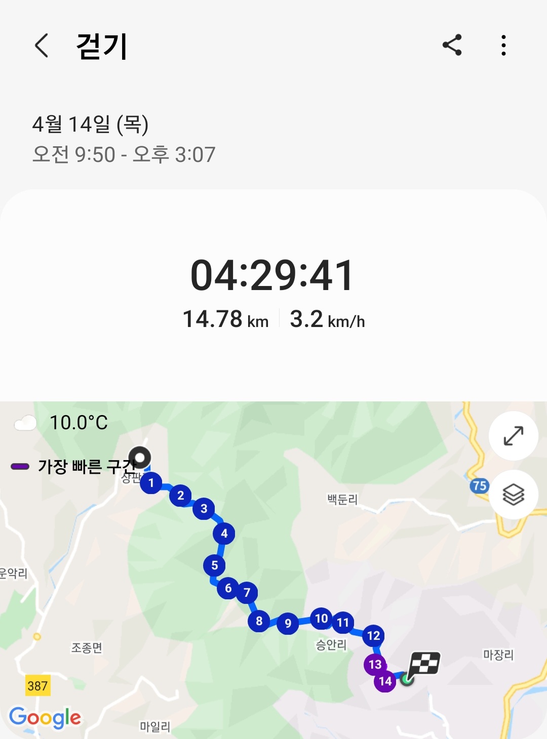▶ 실제 총거리 : 14.78km (갤럭시 워치4 기록)