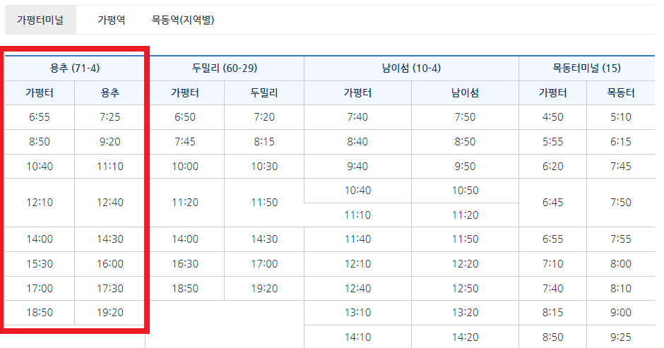 (가평터미널 출발 71-4 번 버스 시간표 참고)
