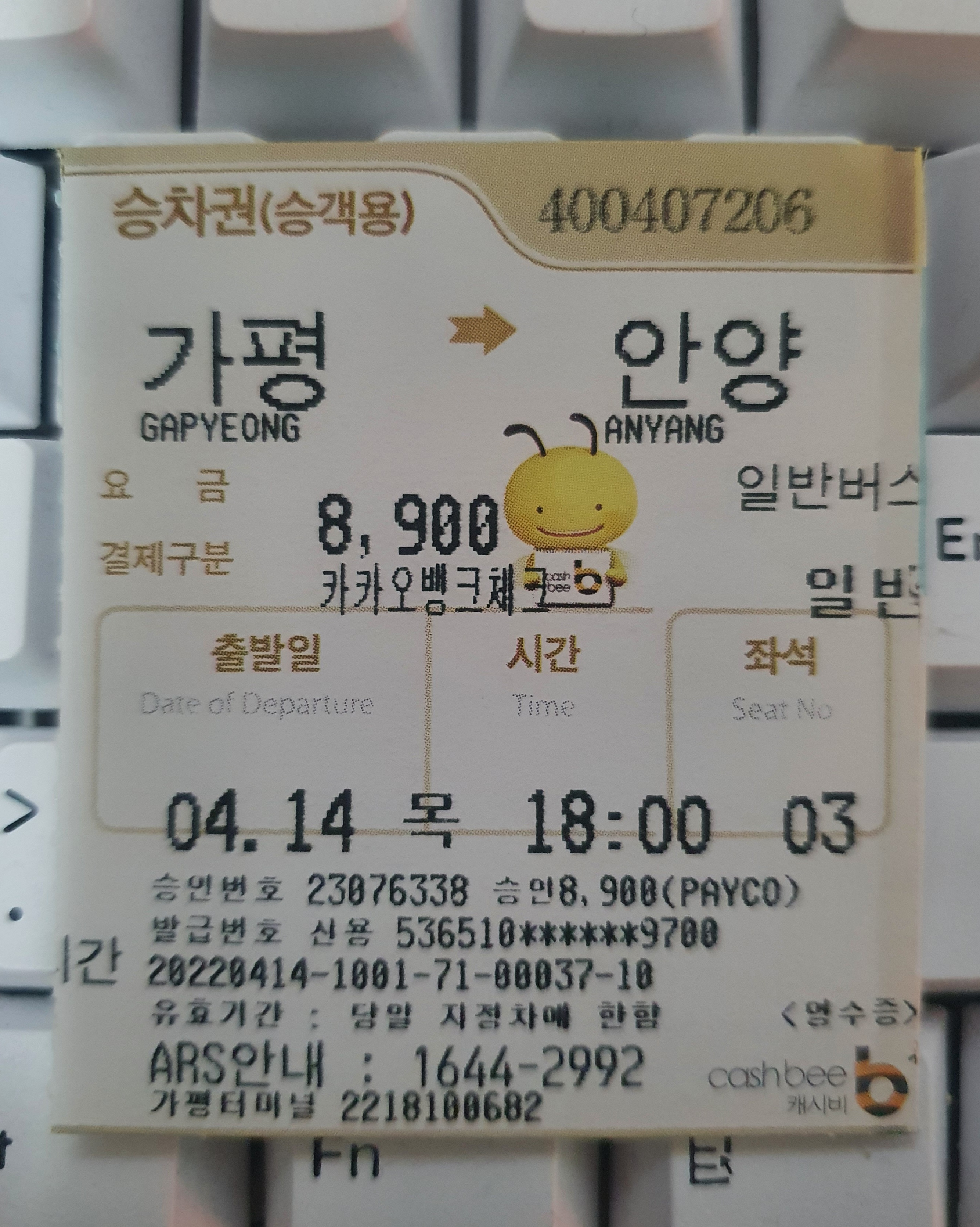- 올때 : 버스 이용 시간 2시간 (가평버스터미널 승차 18시05분 ~ 안양시외버스터미널 하차 20시05분)