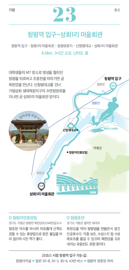 ▶ 주요 코스 : 청평역 입구 ~ 청평1리 마을회관 ~ 청평유원지 ~ 신청평대교 ~ 삼회1리 마을회관