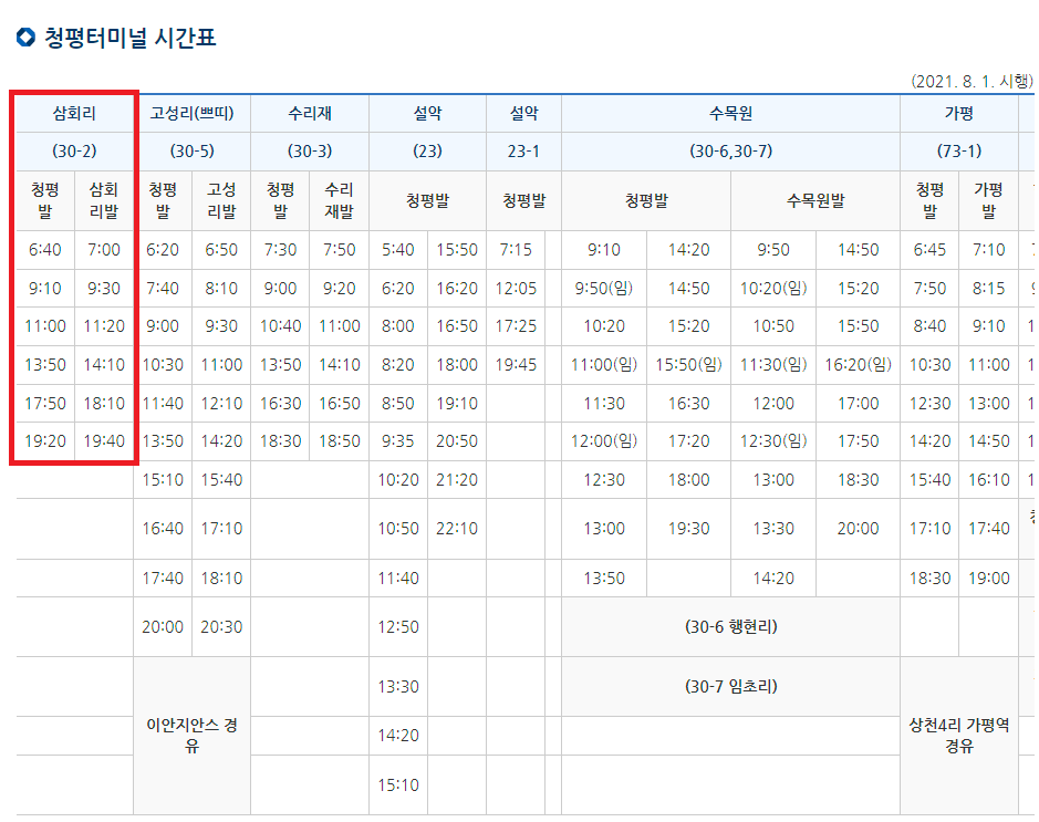 - 갈때 : 버스 이용 시간 1시간 35분 (안양시외버스 승차 07시20분 ~ 청평터미널 하차 08시55분)
