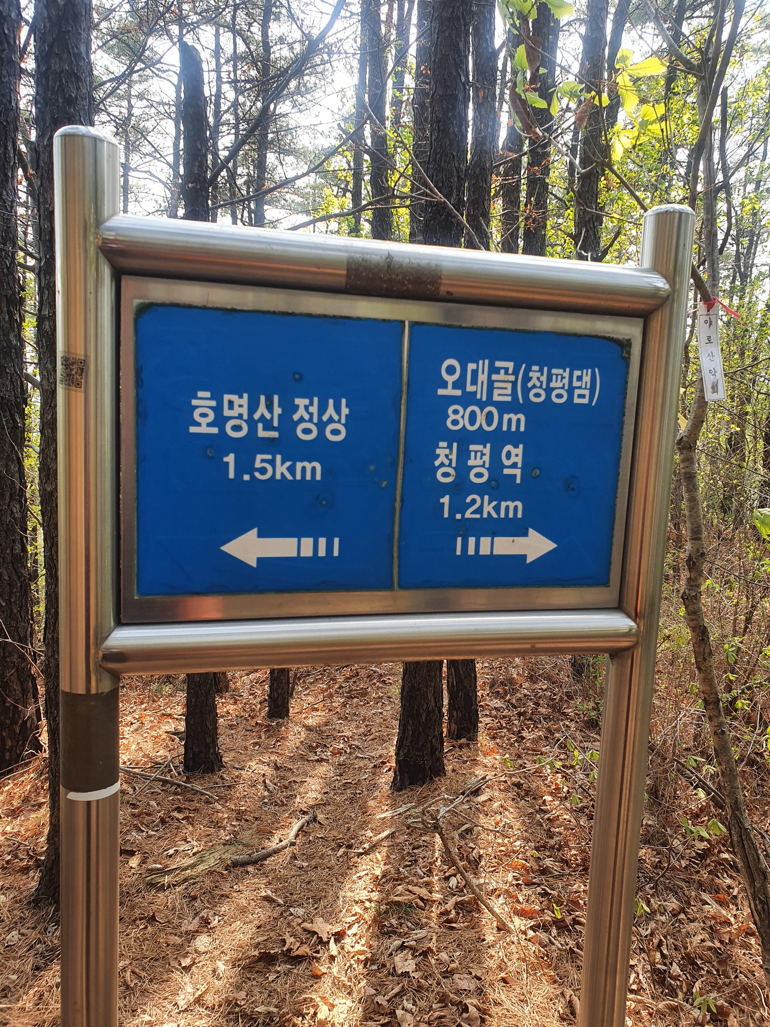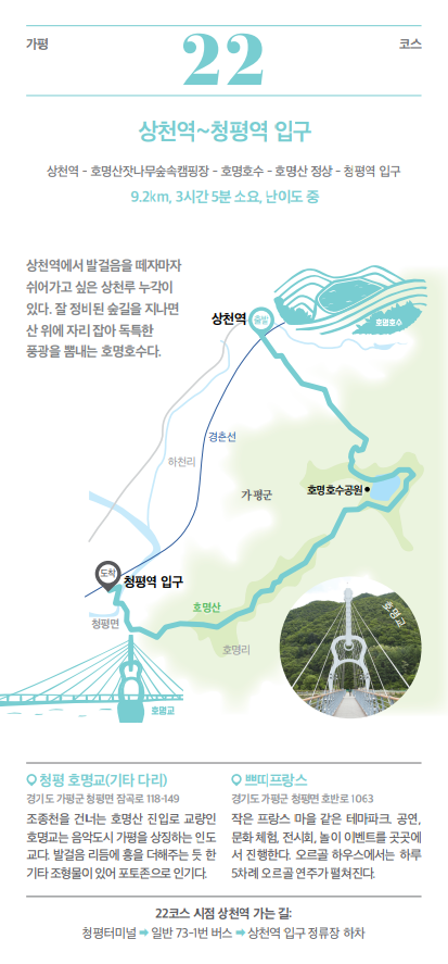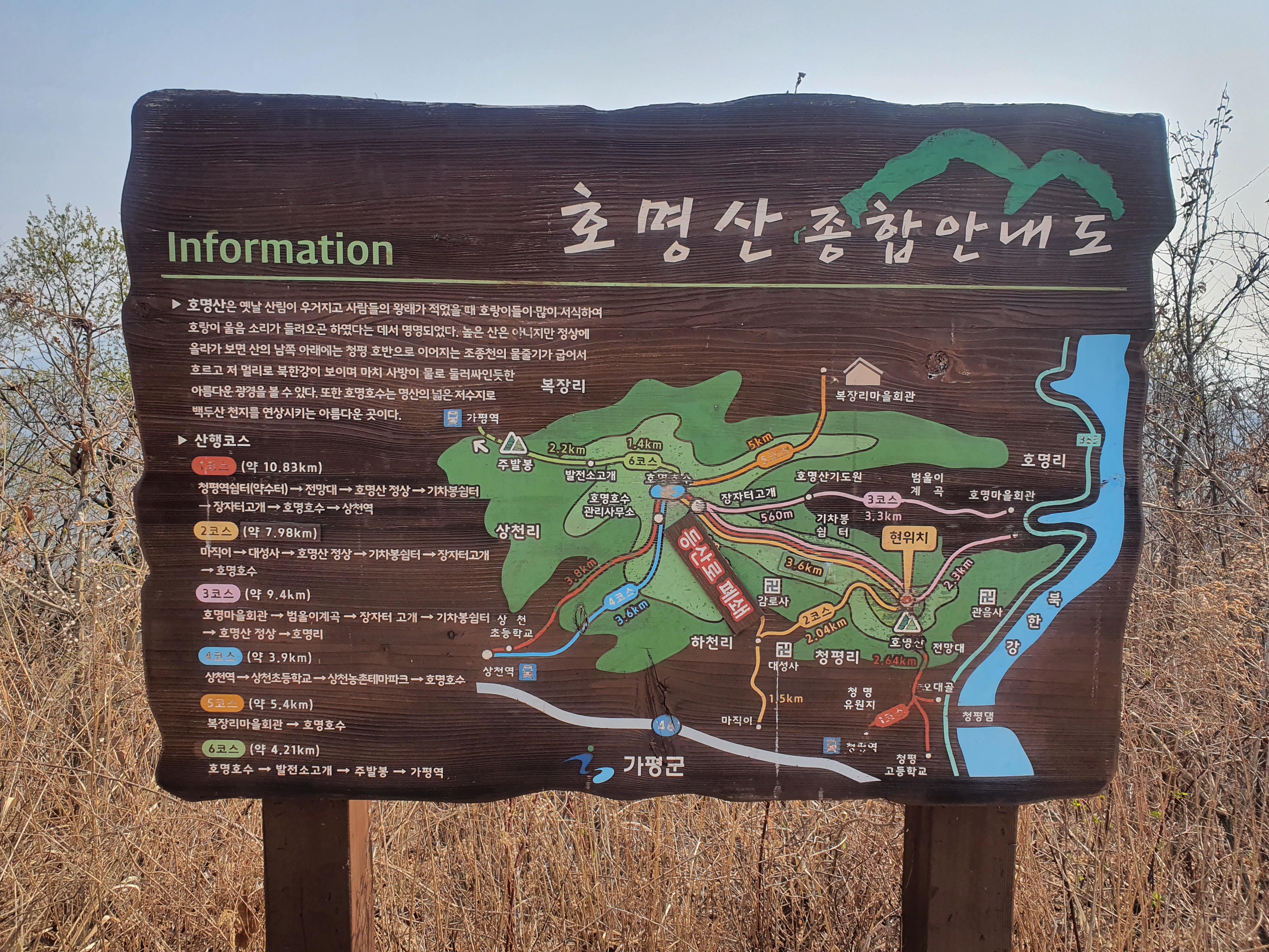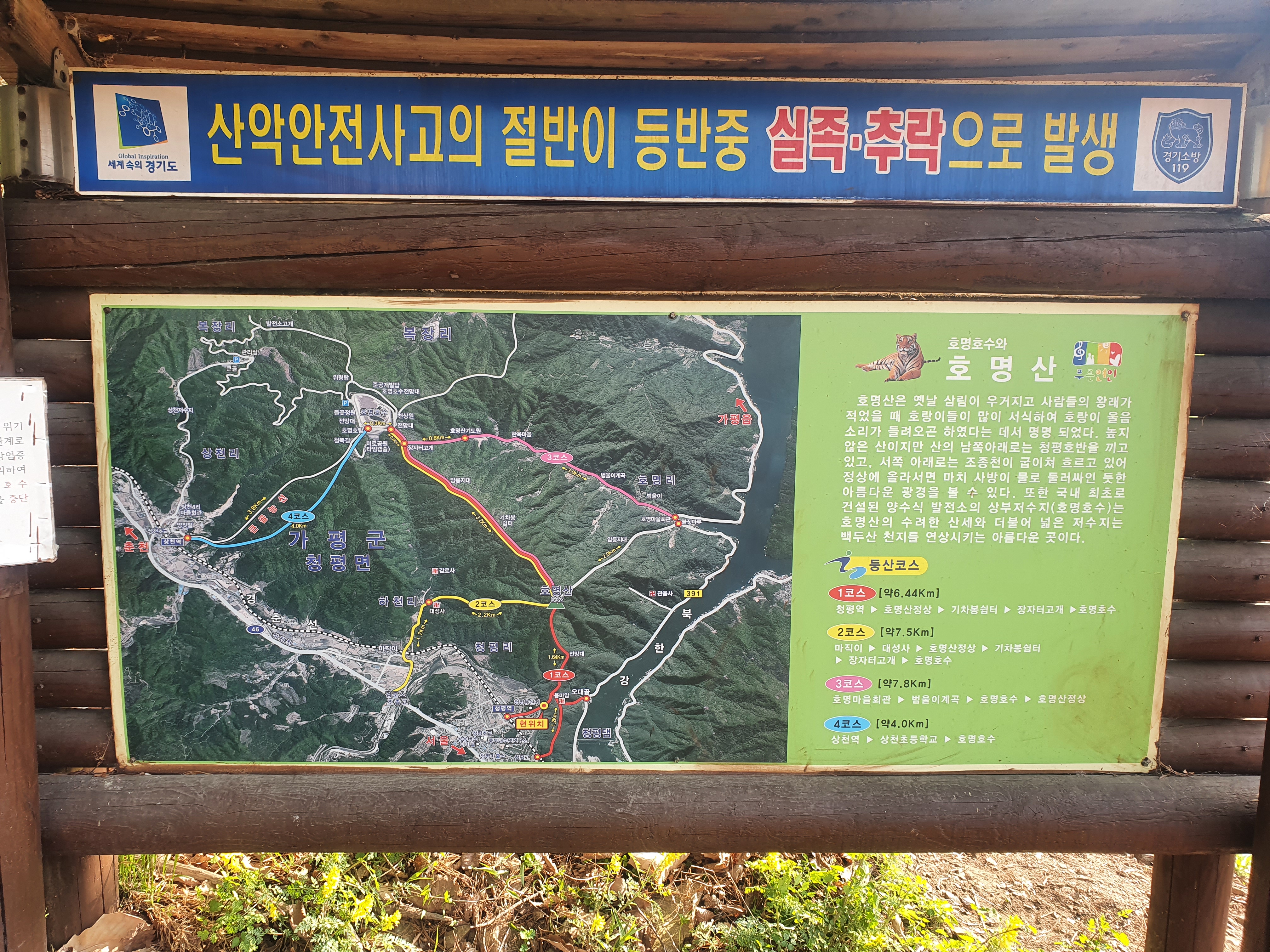 ▶ 주요 코스 : 상천역 ~ 호명산잣나무숲속캠핑장 ~ 호명호수 ~ 호명산 정상 ~ 청평역 입구