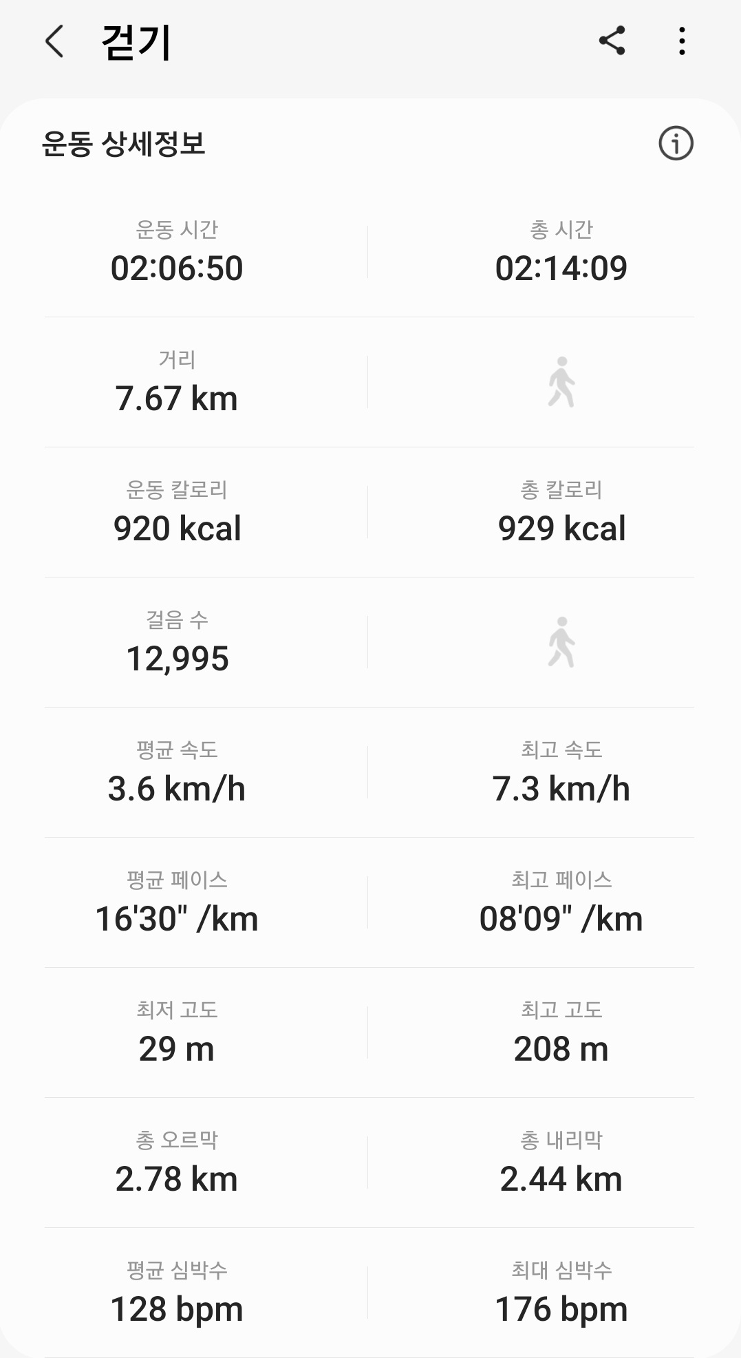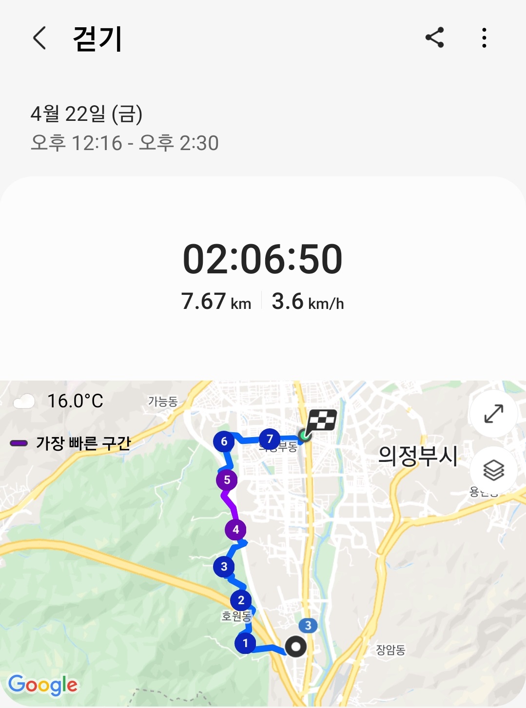 ▶ 실제 총거리 : 7.67km (갤럭시 워치4 기록-시작 약 300m이후부터 측정)
