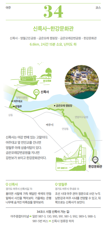 ▶ 주요 코스 : 신륵사 ~ 영월근린공원 ~ 금은모래캠핑장 ~ 금은모래강변공원 ~ 한강문화관
