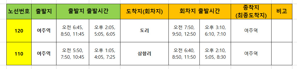 - 여주역행 14:10발 110 승차(14:19~15:12) - 경강선 15:19 여주역 > 판교행 환승(15:13~16:10)