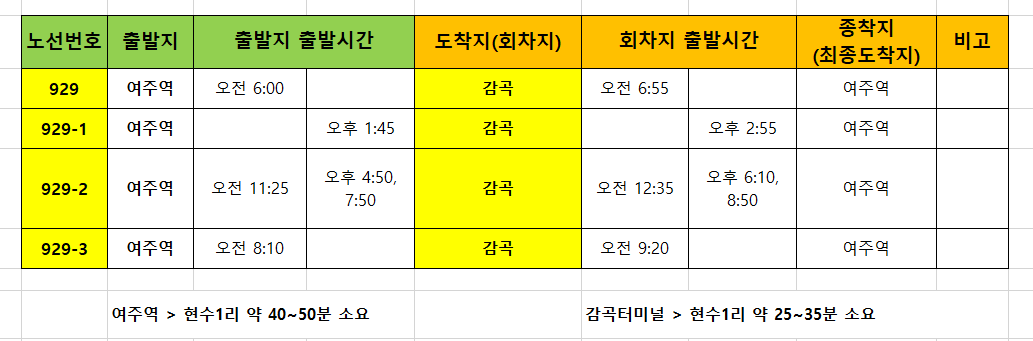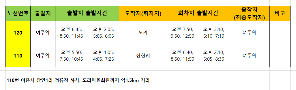 - 여주역 08:50발 120 승차(08:53) - 도리마을회관 하차(09:51)
