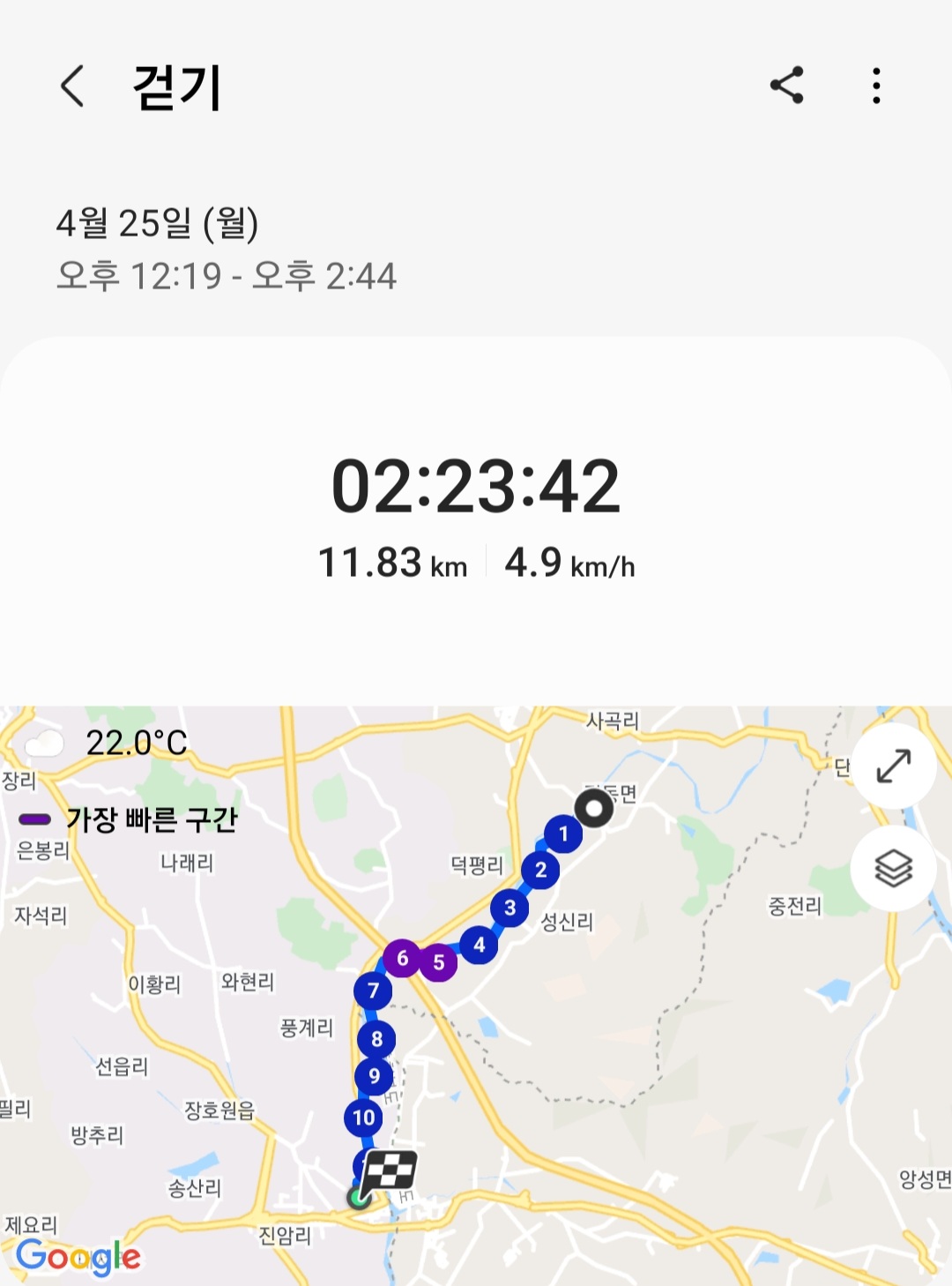 ▶ 실제 총거리 : 11.83km (갤럭시 워치4 기록)