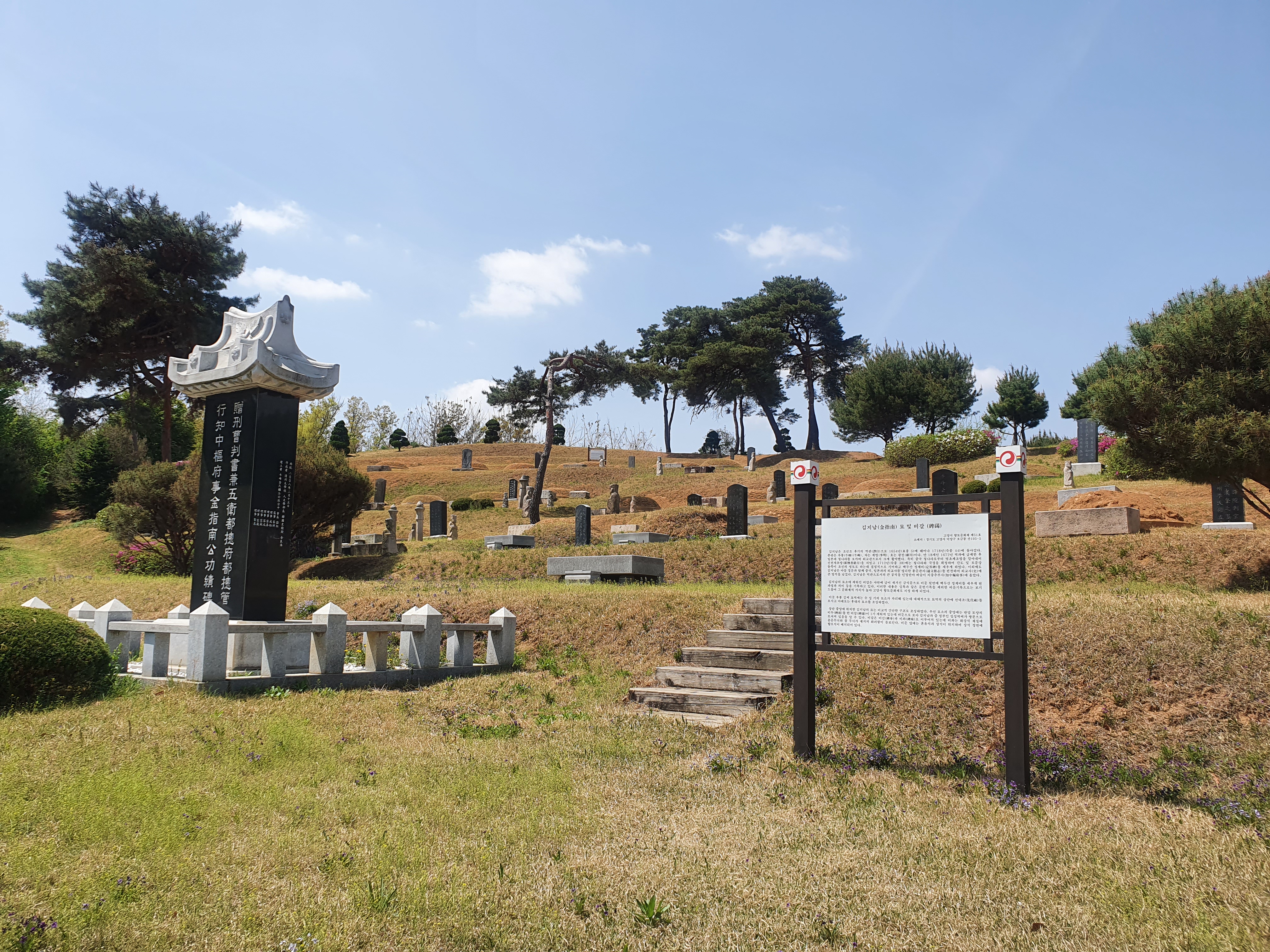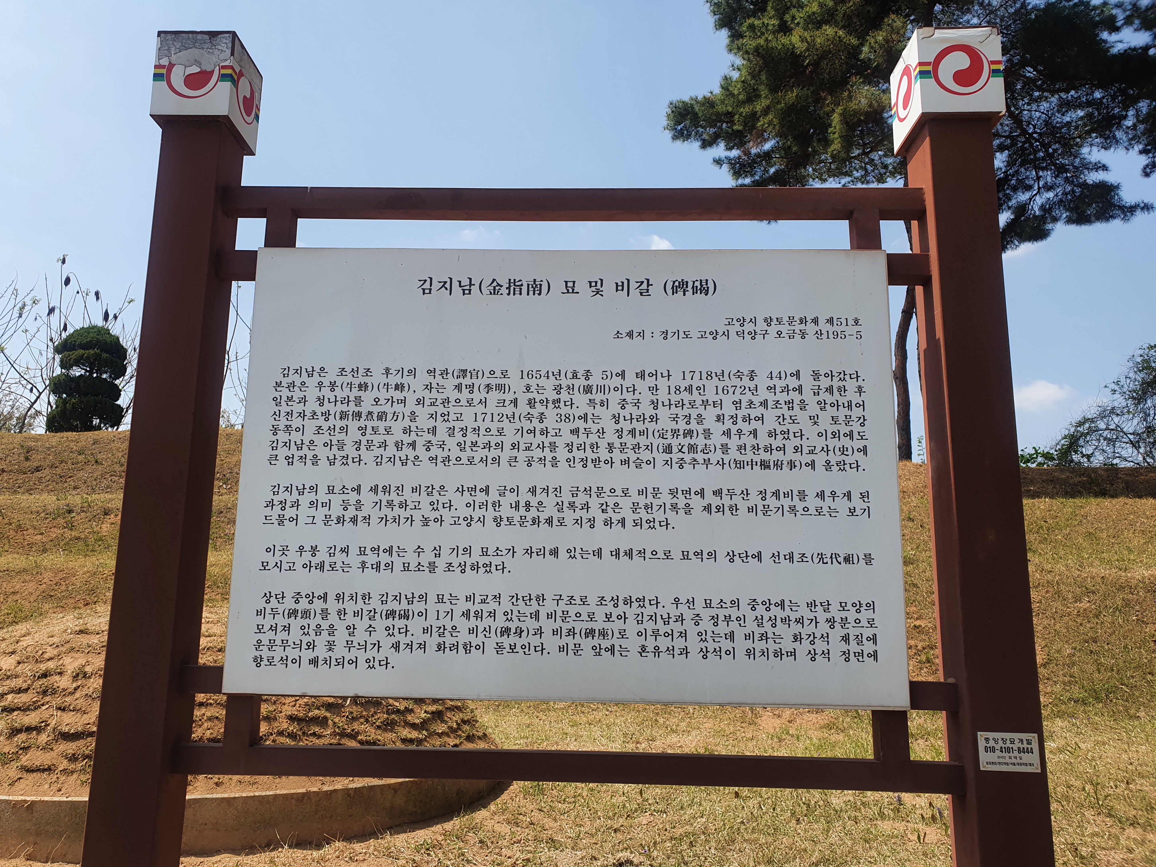 인근 숲길에는 고양시 향토문화재 제 51호 김지남묘 및 비갈이 있다. 김지남은 1712년(숙종 38년) 청나라와 국경선을 확정짓기 위해 양국 대표가 회동할 때 수행원으로 참여했으며 백두산 정계비를 세워 국경선을 확정하는데 공헌했다. 이후 아들 김경문과 함께 사대와 교린의 외교에 대한 연혁·역사·행사·제도 등을 체계화한 ‘통문관지’를 편찬하는 성과를 거두었다. 통문관지는 당시 외교에 종사하던 실무진의 필수서가 되었고, 이에 그치지 않고 일본과 중국에 건너가 조선과 외교하는데 지침서가 되었다.