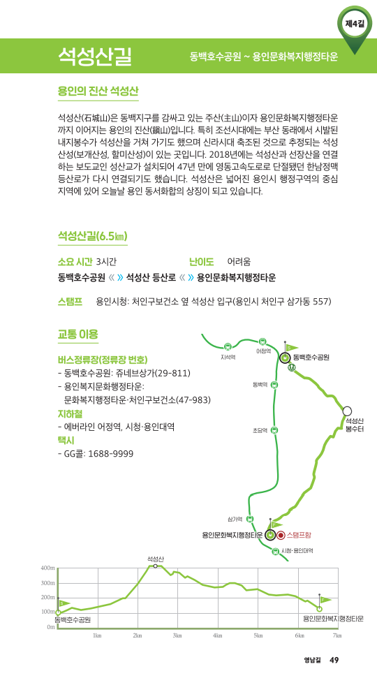 석성산길은 동백호수공원에서 시작하여 석성산 등산로를 거쳐 용인문화복지행정타운으로 가는 길이다. 총 6.5km로 3시간 정도가 소요되는 중급 코스이다. 스탬프는 용인시청에서 받을 수 있다.