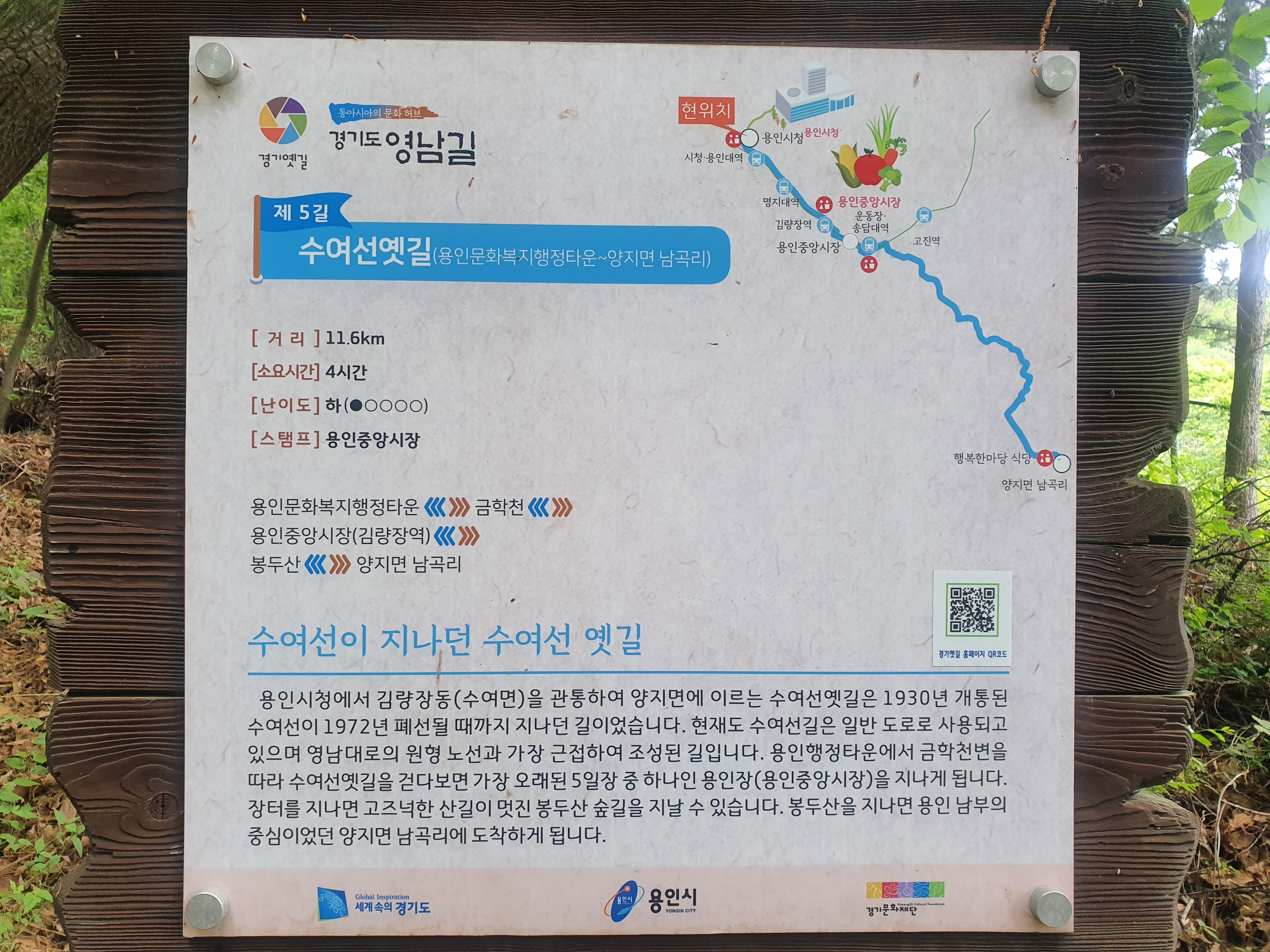 수여선옛길은 용인문화복지행정타운에서 시작하여 금학천, 용인중앙시장(김량장역), 봉두산을 거쳐 양지면 남곡리에 이르는 길이다. 총 11.6km로 4시간 정도가 소요되는 하급 코스이다. 용인중앙시장에서 스탬프를 받을 수 있다.