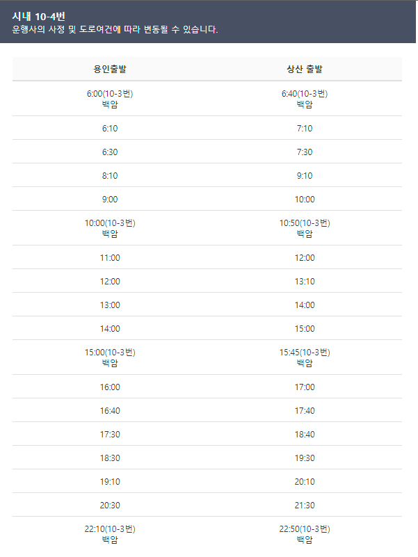 (78번 백암터미널 09:10발. 10-4번 기점 09:10발 보다 약 30분 빠름)