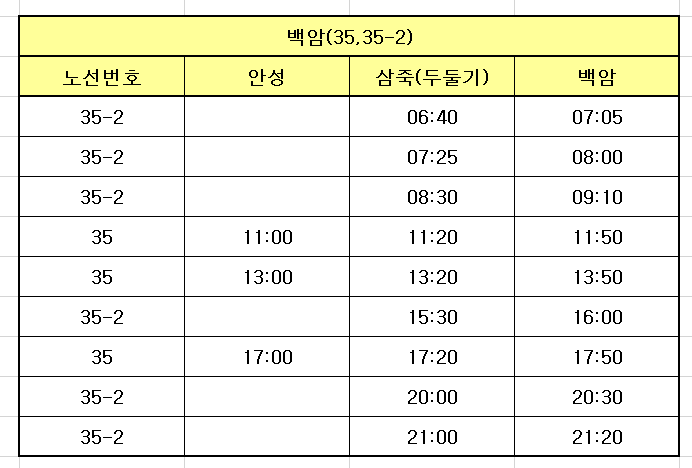 황새울입구 35(백암터미널 13:50발) 승차(14:02~14:34) > 구)안성터미널 70 환승(14:43~15:26) > 1호선 평택역 환승 (15:31) > 안양역 하차 (16:41)