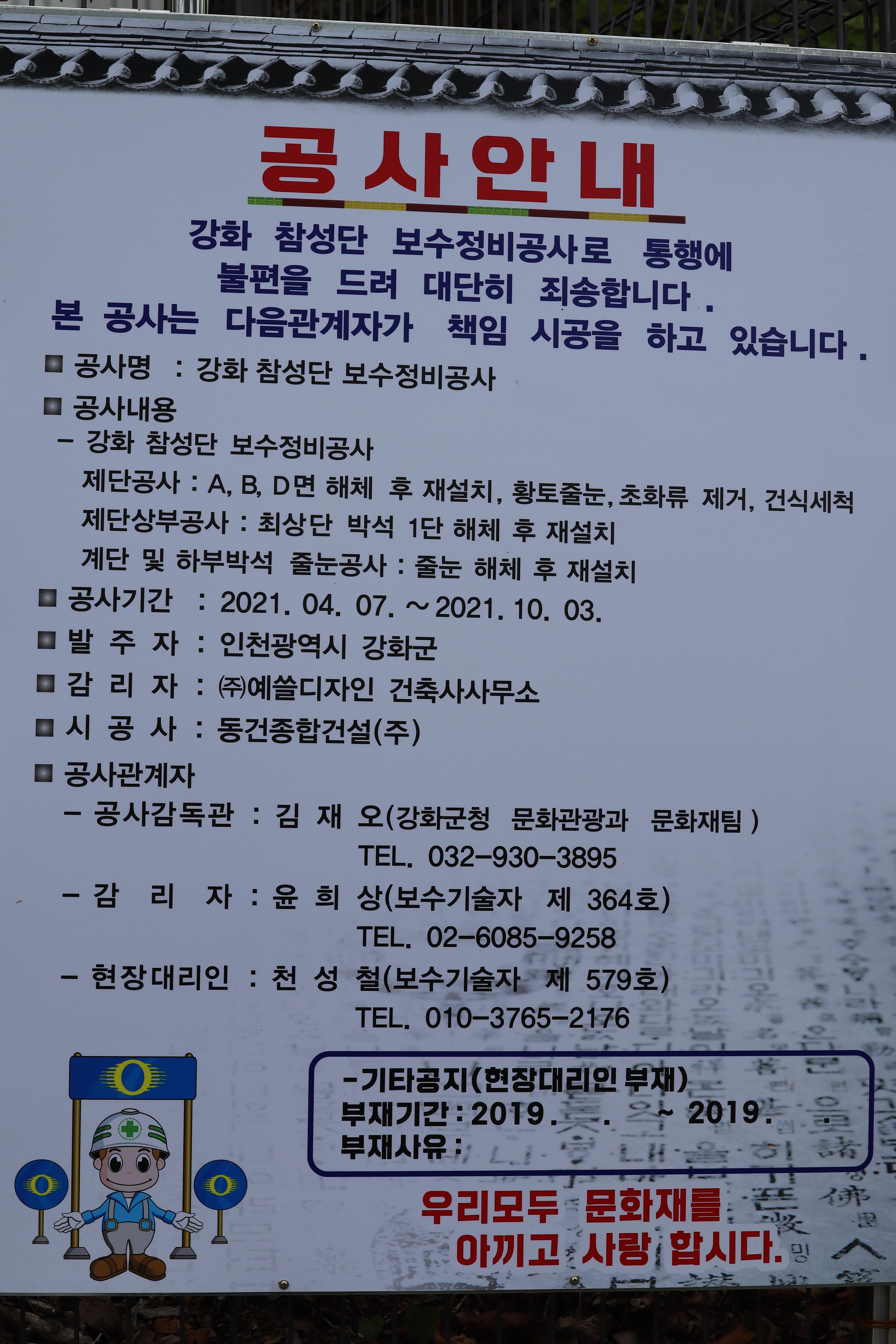하여튼 마니산은 계단로 이용해 정상까지 갔지만 참성단 입구는 굳게 닫혀 공사안내문만.