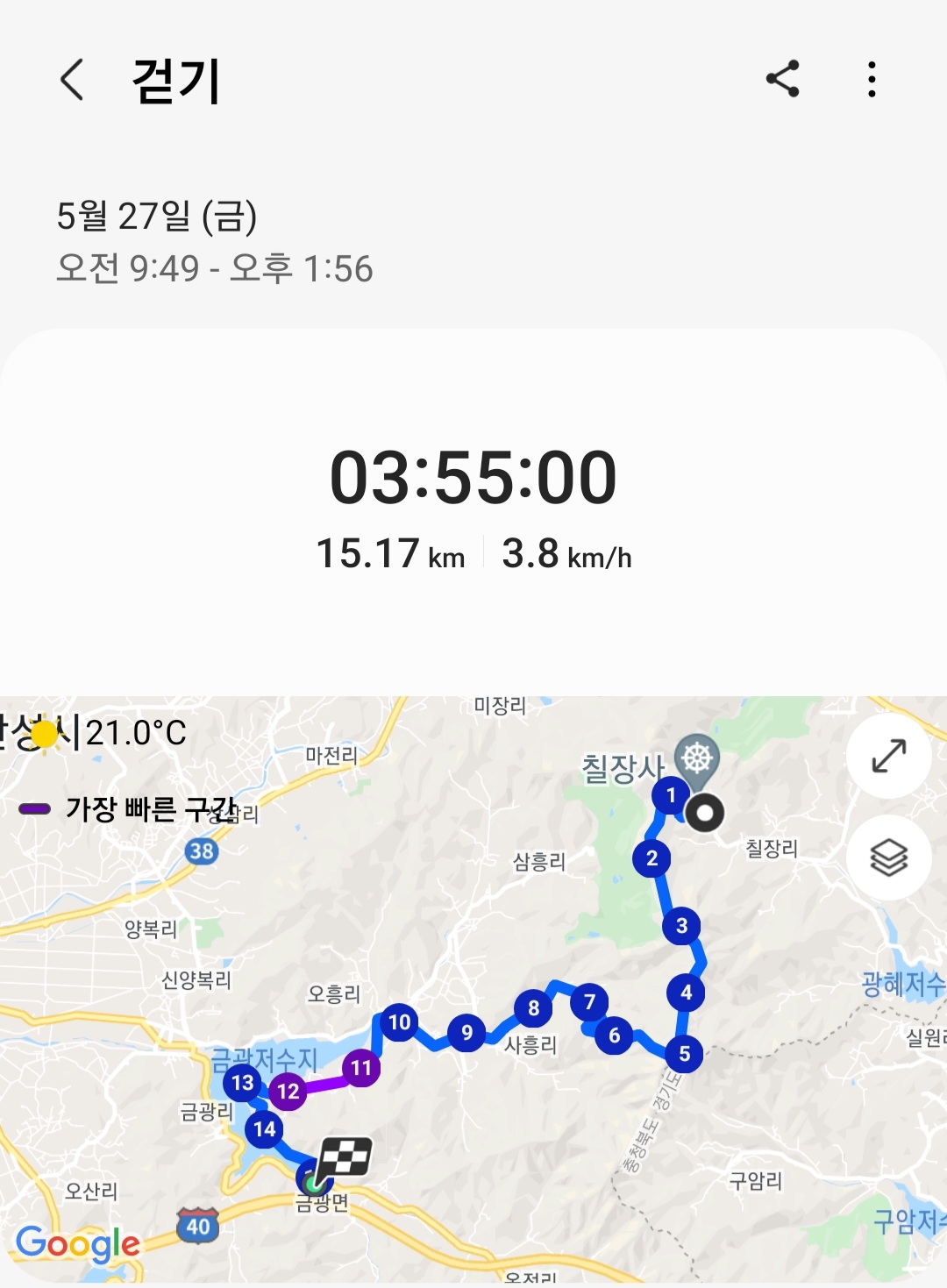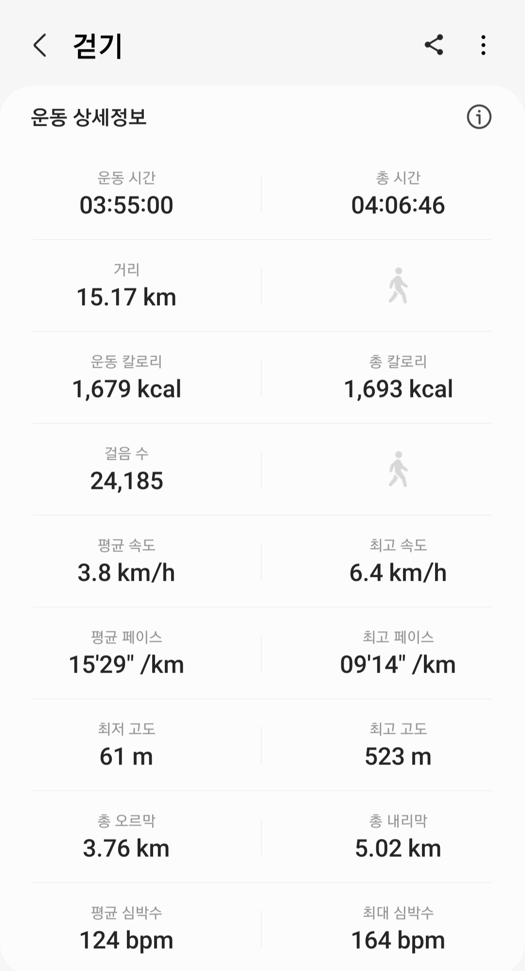 ▶ 실제 총거리 : 15.17km (갤럭시 워치4 기록)