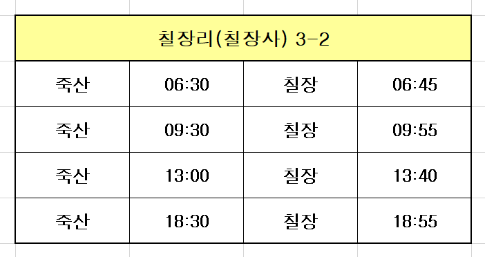 안양시외버스 죽산행(07:10발) 승차(07:17~08:47) > 죽산터미널 3-2 (09:30발) 환승(09:31) > 칠장사 하차(09:46)