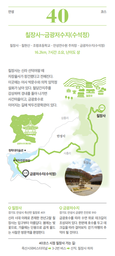 ▶ 주요 코스 : 칠장사 ~ 칠현산 ~ 덕성산 ~조령초등학교 ~ 금광호수(청록뜰-혜산정-수석정)