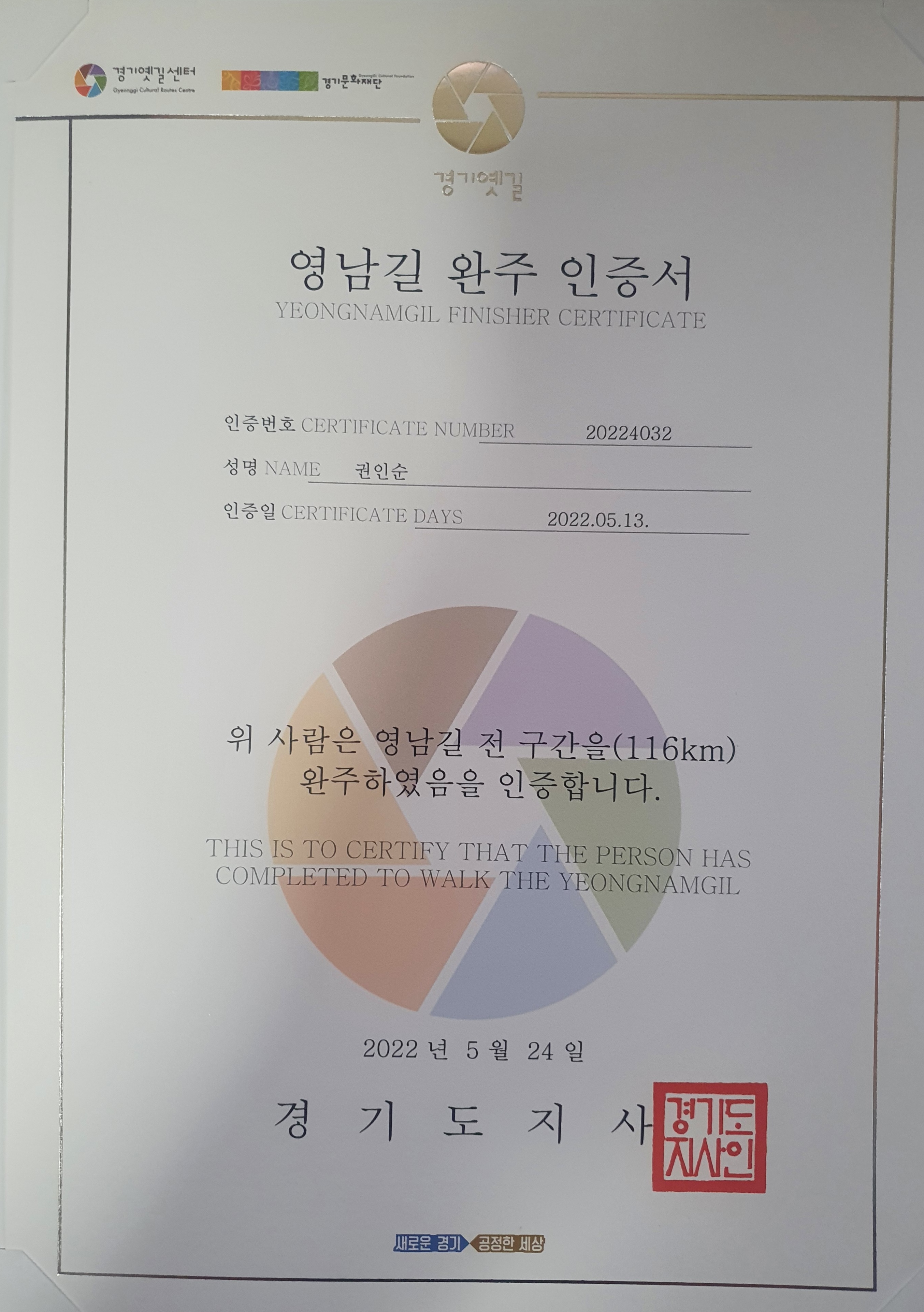 걷기 2022.05.28 경기옛길 영남길 완주 인증서 insun20140724 2022. 5. 29. 12:04 ※ 경기옛길 영남길 완주 인증서 - 2022.05.13 완주 인증서 신청. 25일에 받음. ※ 코스별 기록 ▶ 2022.03.05 영남길 제1길 달래내고개길 ▶ 2022.03.05 영남길 제2길 낙생역길 ▶ 2022.04.13 영남길 제3길 구성현길 ▶ 2022.05.08 영남길 제4길 석성산길 ▶ 2022.05.08 영남길 제5길 수여선옛길 ▶ 2022.05.10 영남길 제6길 은이성지·마애불길 ▶ 2022.05.12 영남길 제7길 구봉산길 ▶ 2022.05.11 영남길 제8길 죽주산성길 ▶ 2022.05.13 영남길 제9길 죽산성지순례길 ▶ 2022.05.13 영남길 제10길 이천옛길