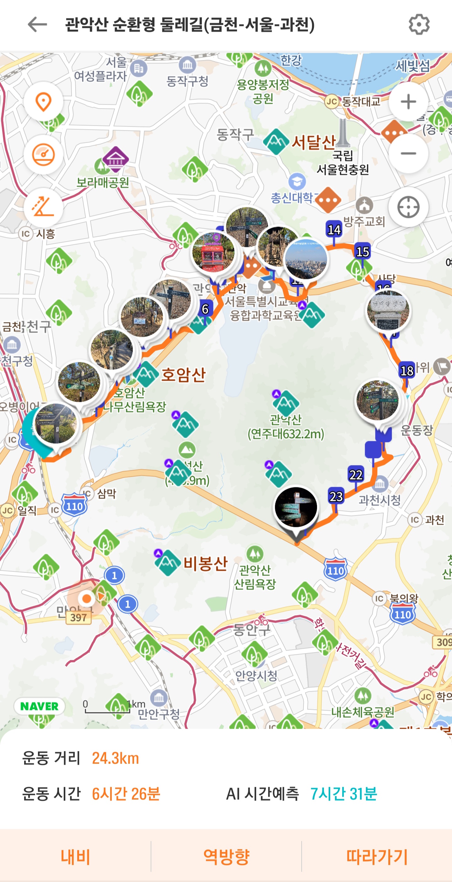 ▶ 주요 코스 : 석수역~호암사~서울대입구~낙성대공원~사당사거리~남태령~과천향교~간촌약수터