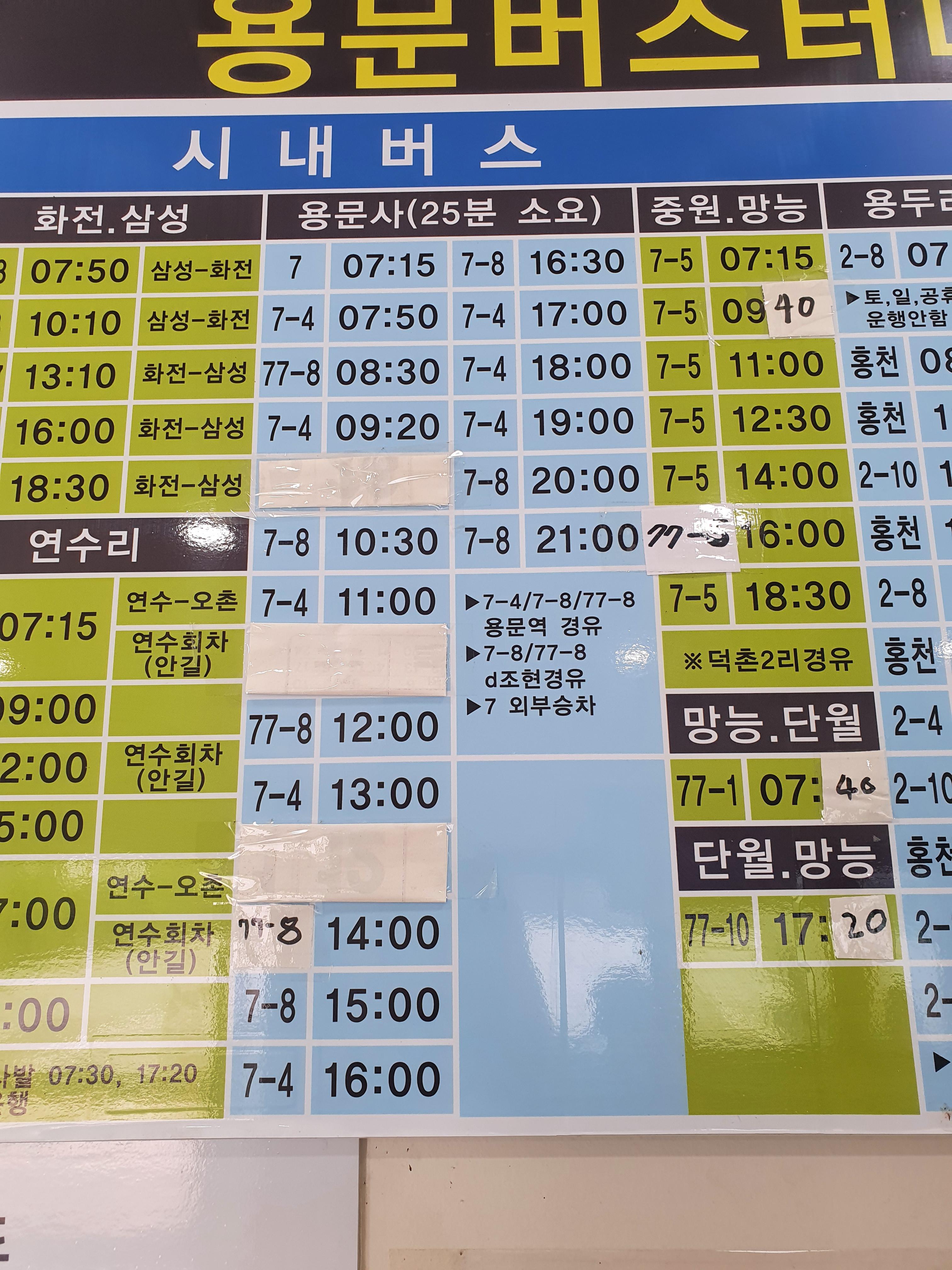 - 17시31분 용문터미널 하차 - 18시00분 G9311번 버스 탑승 - 19시35분 잠실환승센터 하차