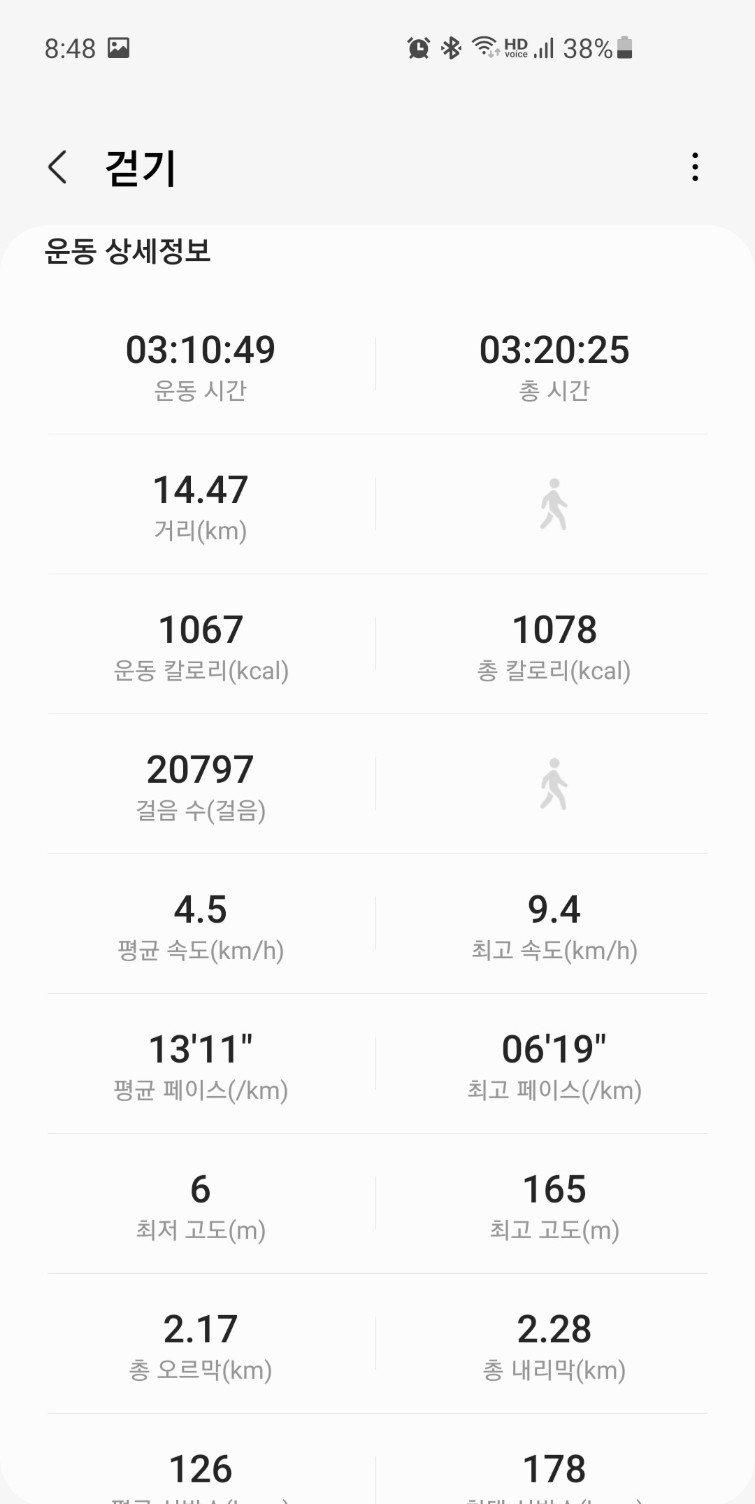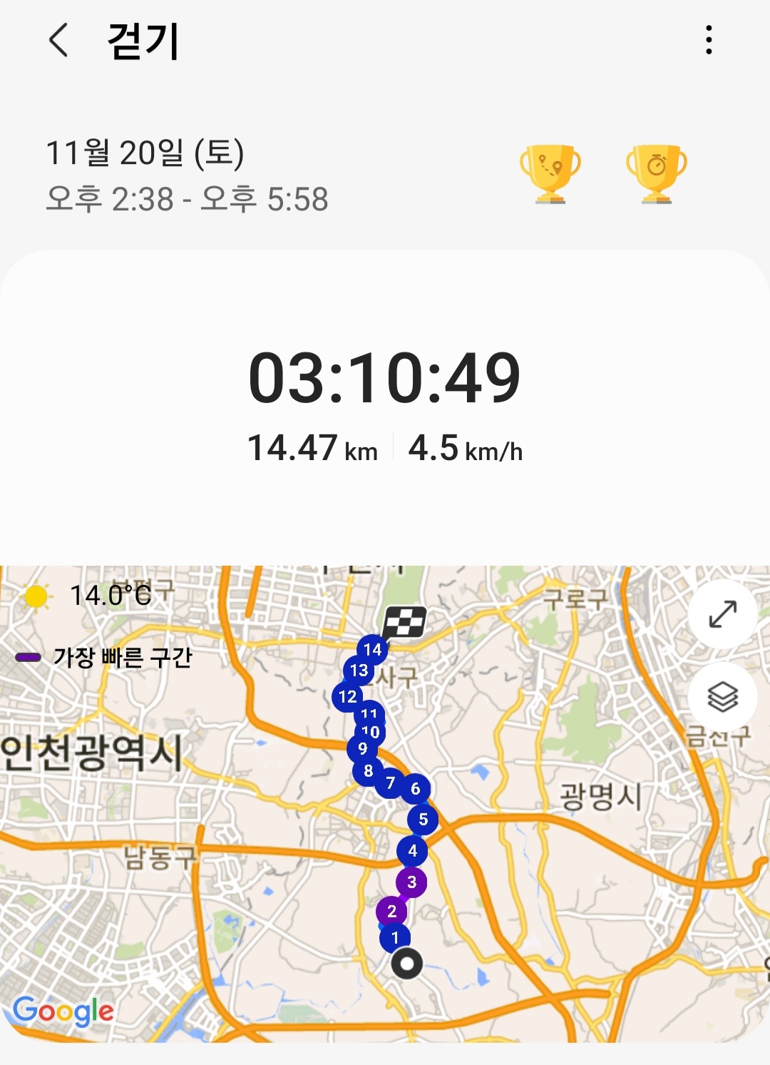 ▶ 실제 총거리 : 14.47km (갤럭시 워치4 기록)