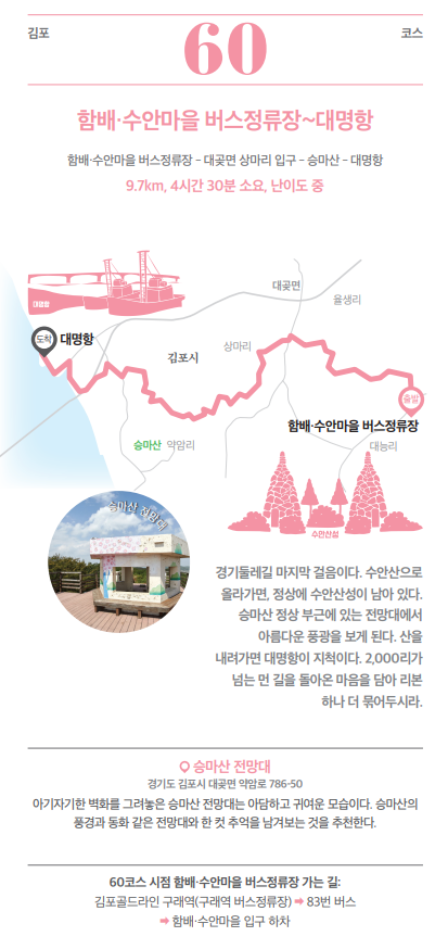 ▶ 주요 코스 : 함배ㆍ수안마을 버스정류장 ~ 대곶면 상마리 입구 ~ 승마산 ~ 대명항