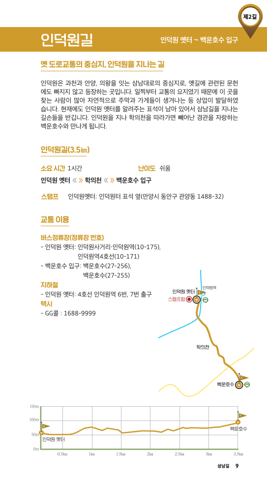 인덕원을 지나는 길은 인덕원 옛터에서 시작하여 학의천을 지나 백운호수로 가는 길이다. 총 3.5km로 1시간 정도 소요가 되는 하급 코스이다. 남태령 옛길 표석에서 스탬프를 받을 수 있다.
