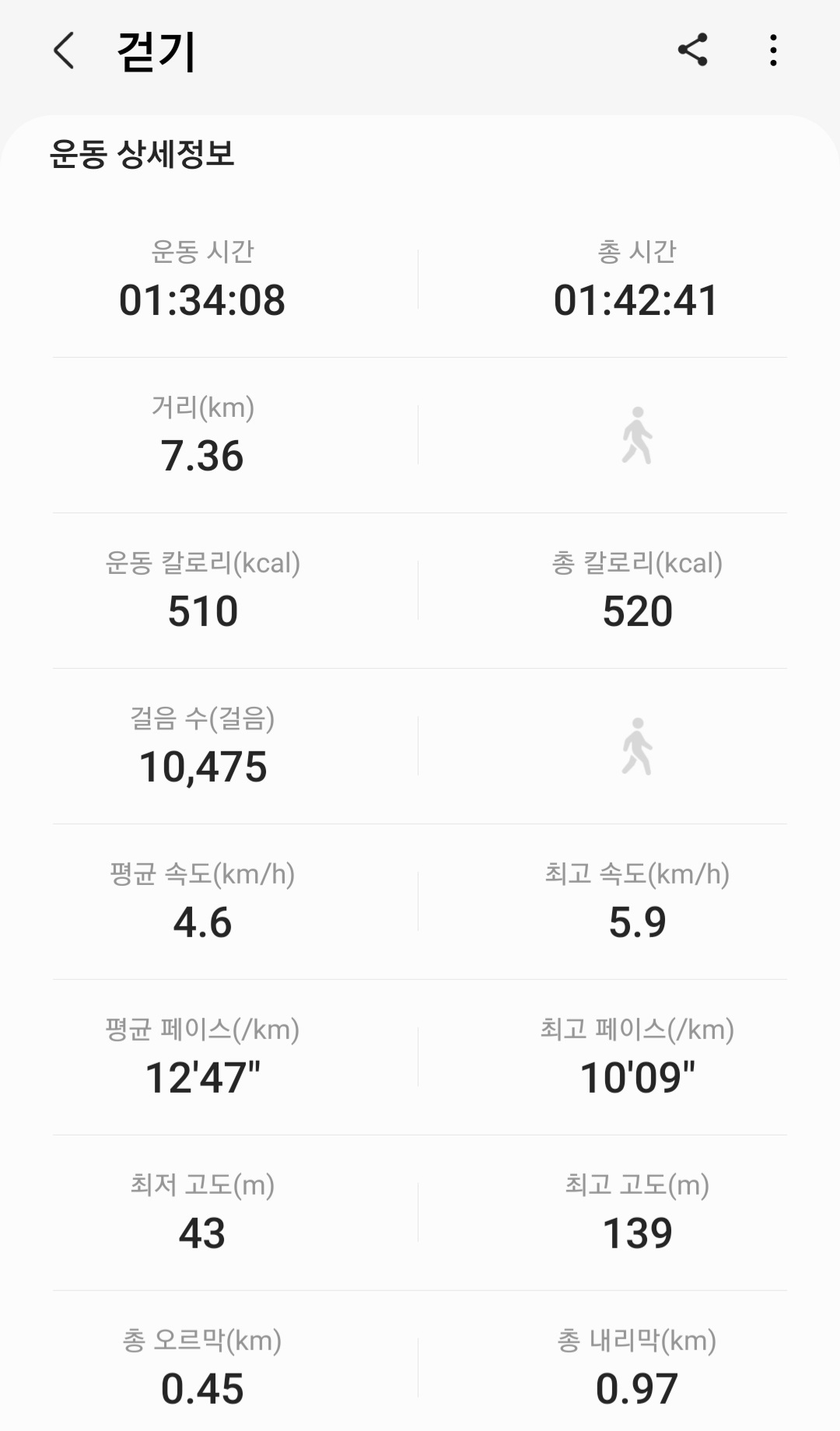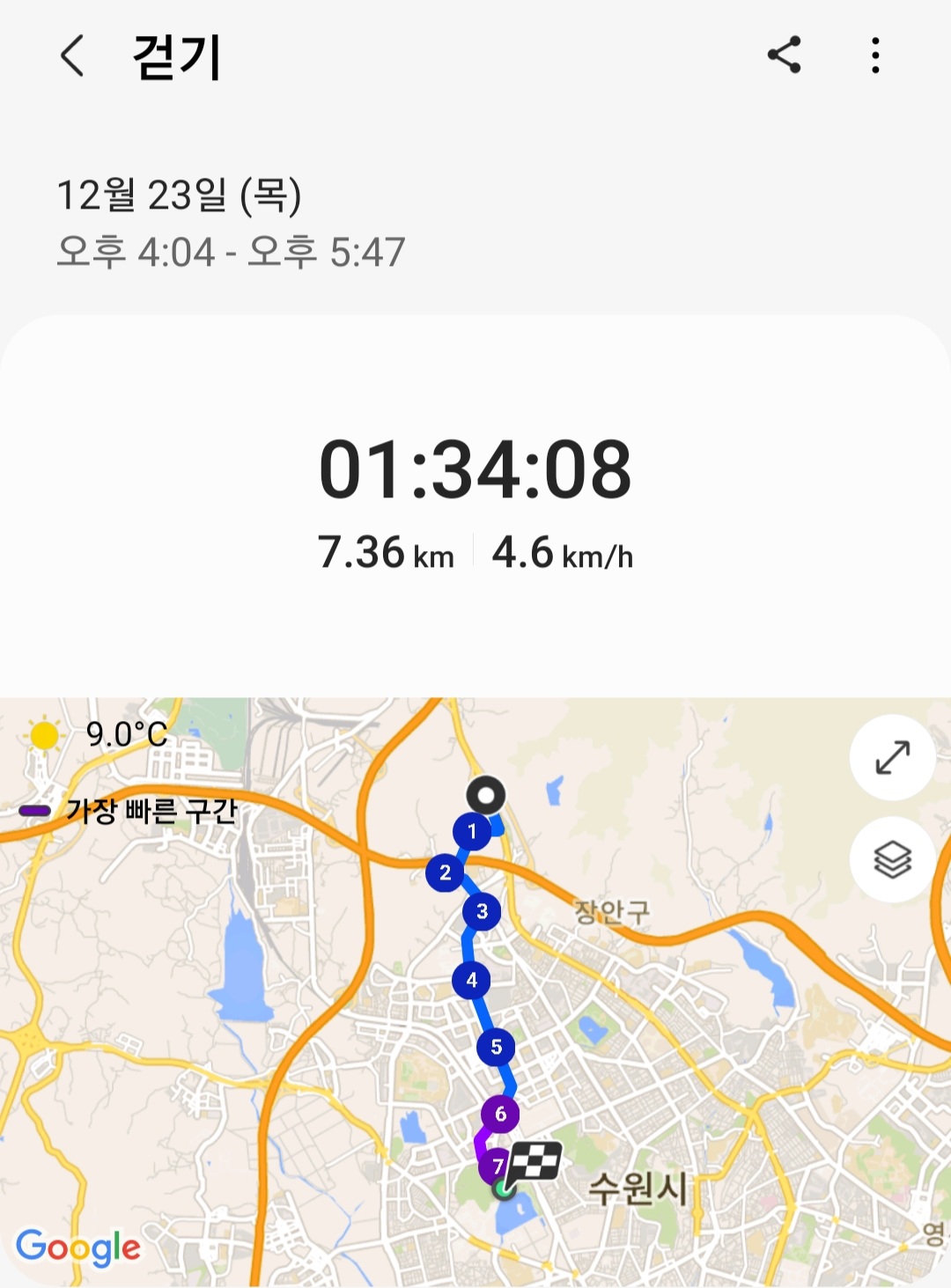 ▶ 실제 총거리 : 7.36km (갤럭시 워치4 기록)