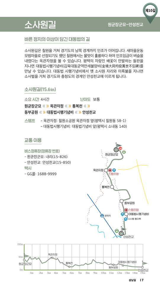 소사원길은 원균장군묘에서 시작하여 옥관자정, 통복천, 동부공원, 대동법시행기념비를 거쳐 안성 천교까지 가는 길이다. 총 14.5km로 4시간 정도가 소요되는 중하급 코스이다. 옥관자정과 대동법시행기념비에서 스탬프를 받을 수 있다.