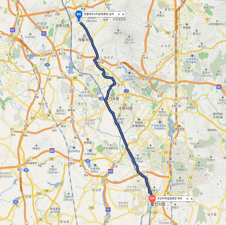 → 수원 301번 한솔테크노타운 정류장 승차. 58개 정류장 30km 이동. 오산터미널 정류장 하차