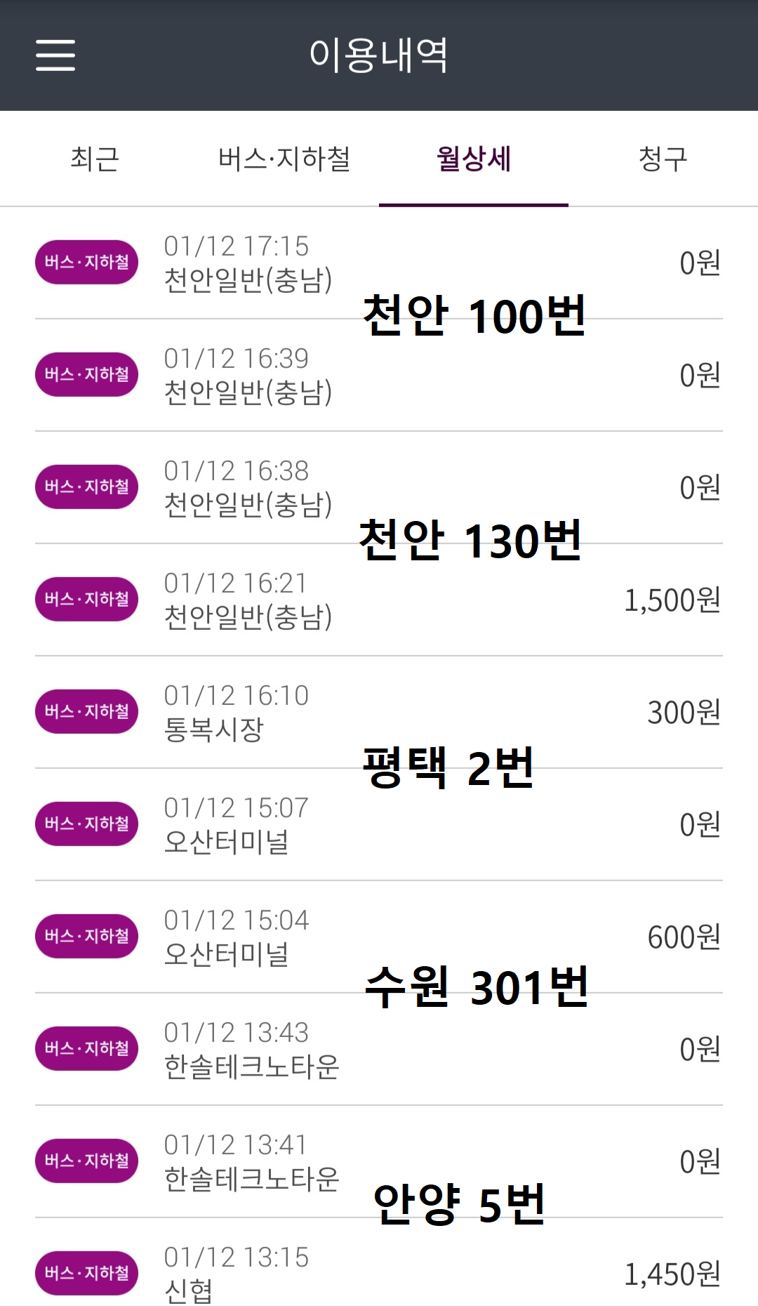 ▶ 버스 총요금 : 3,850원 (티머니 이용 기록)