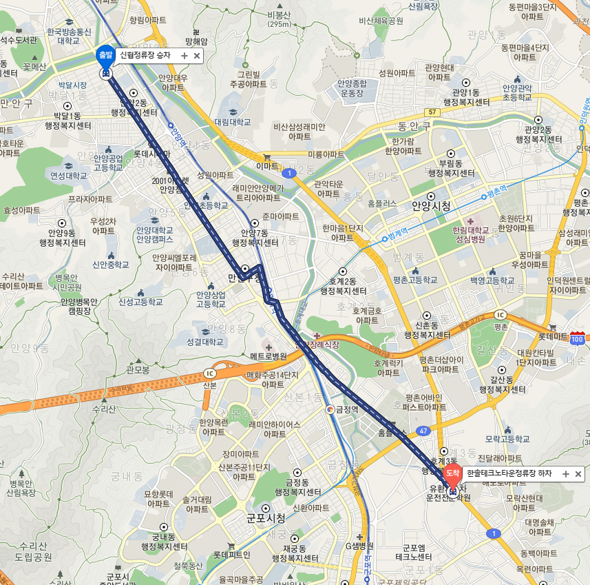 ▶ 안양 5번 신협 정류장 승차. 17개 정류장 6.8km 이동. 한솔테크노타운 정류장 하차