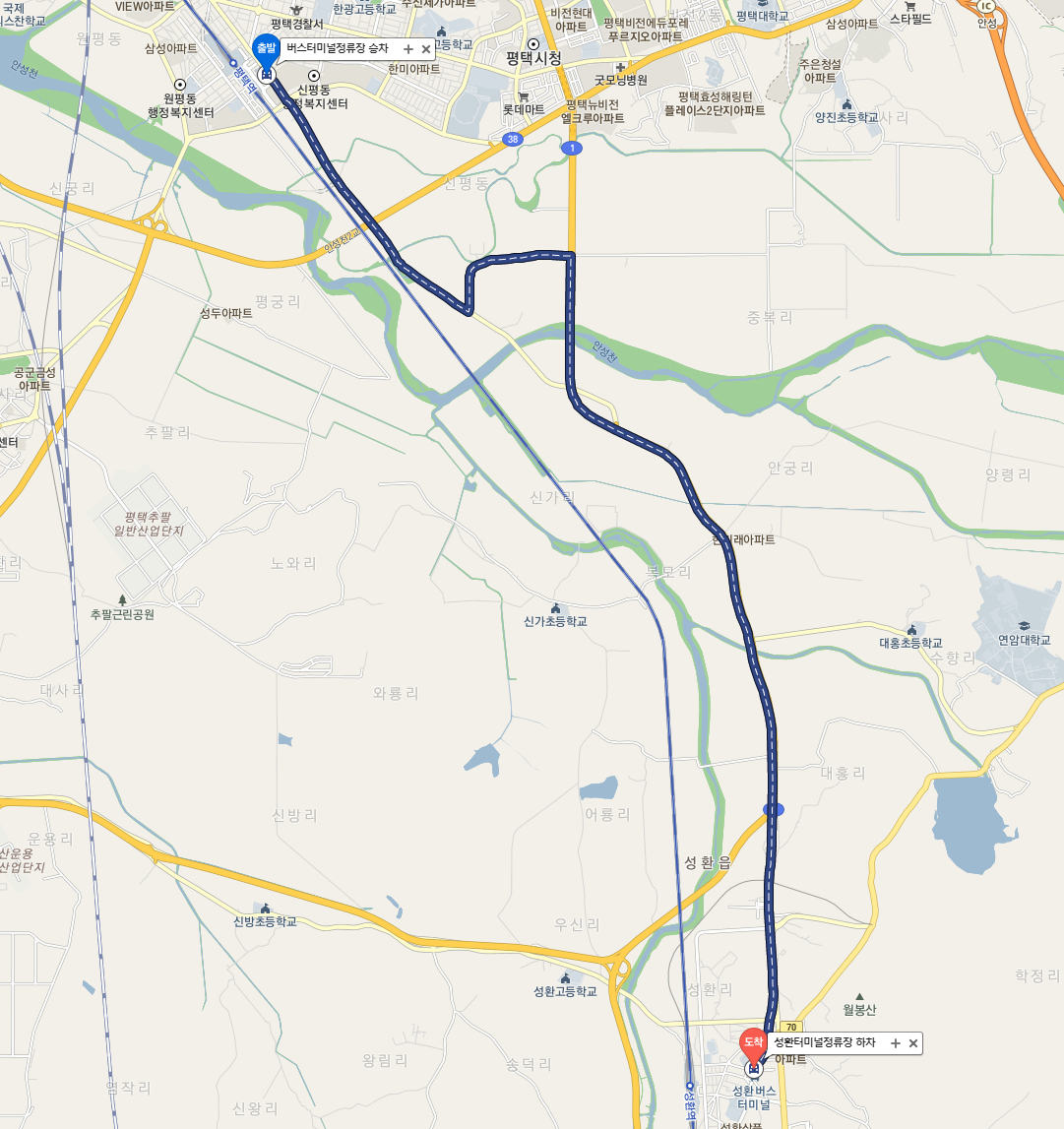 → 천안 130번 평택버스터미널 정류장 승차. 15개 정류장 11.2km 이동. 성환터미널 정류장 하차