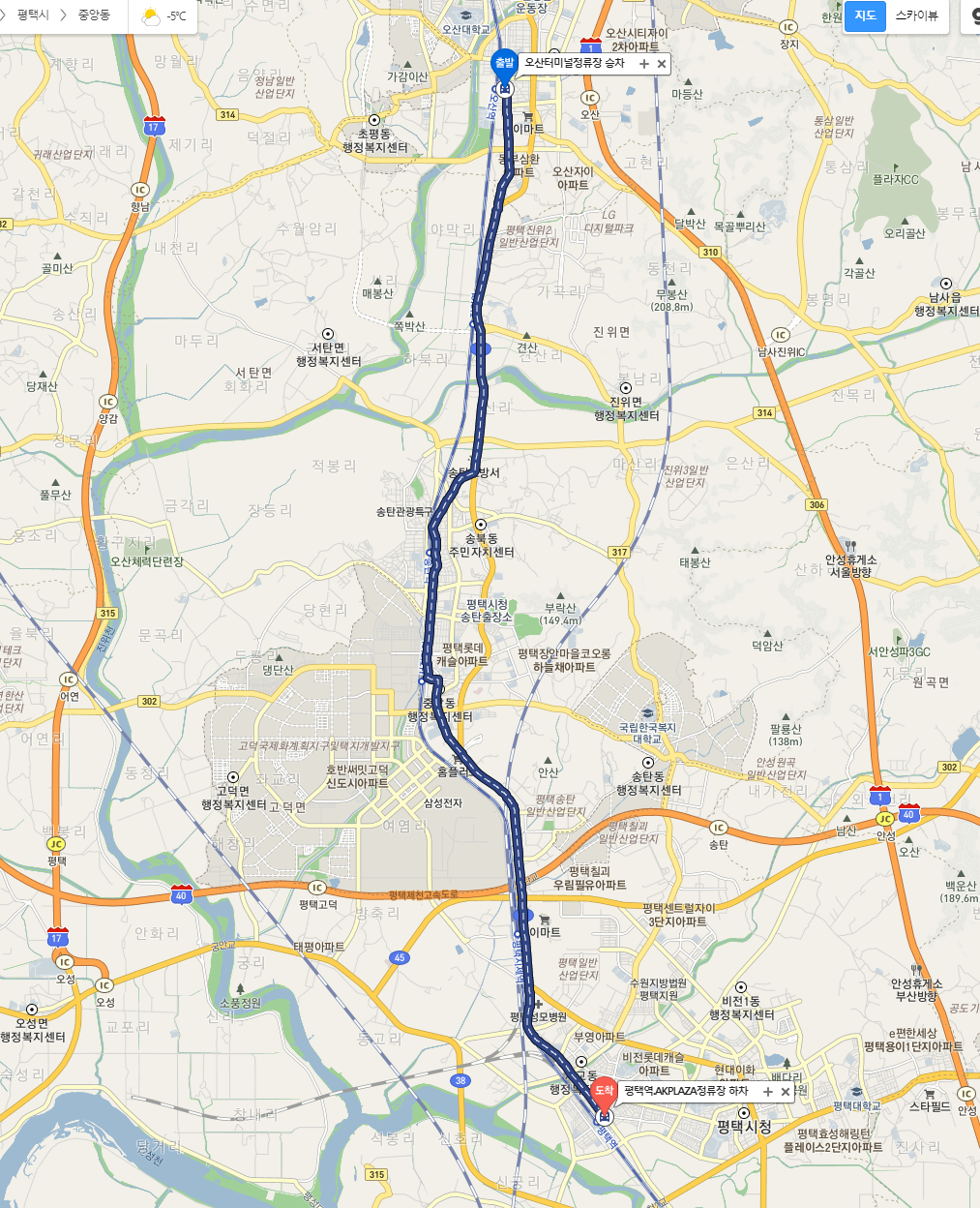 → 평택 2번 오산터미널 정류장 승차. 43개 정류장 18.8km 이동. 평택역.AKPLAZA 정류장 하차