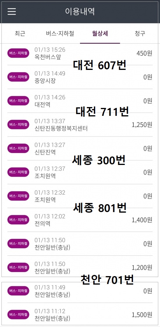 (대전시계외 추가요금으로 인해 앞문 단말기 찍고 하차해야함. 방송으로 나옴.