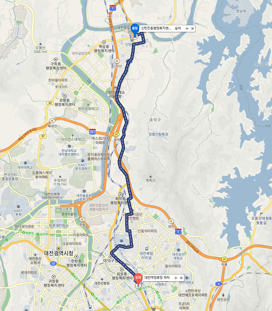 → 대전 711번 신탄진동행정복지센터 정류장 승차. 33개 정류장 17km 이동. 대전역 정류장 하차