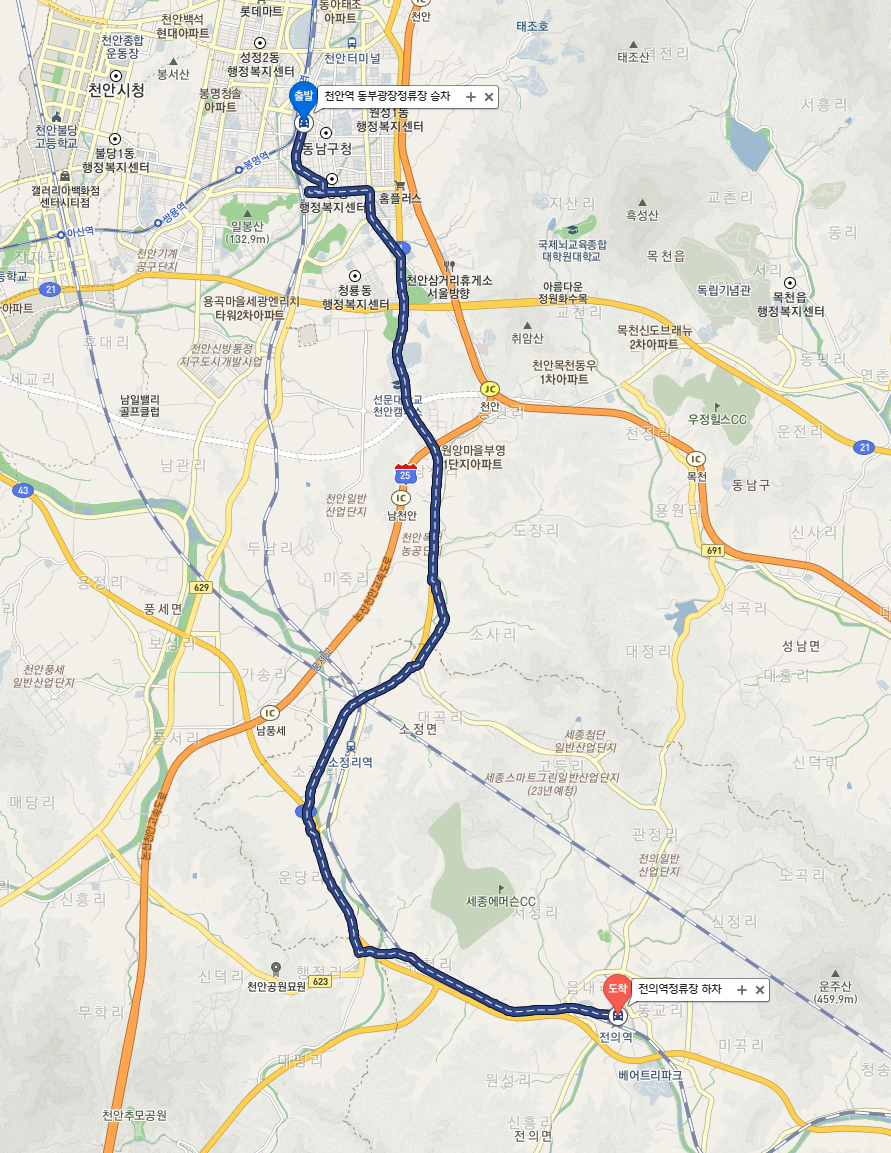 ▶ 천안 701번 천안역 동부광장 정류장 승차. 32개 정류장 20.9km 이동. 전의역 정류장 하차