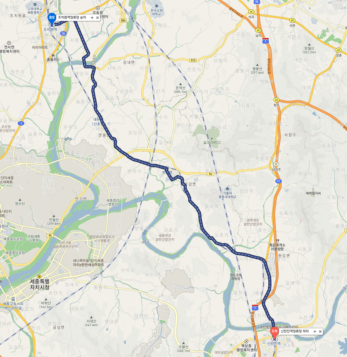 → 세종 300번 조치원역 정류장 승차. 41개 정류장 25.4km 이동. 신탄진역 정류장 하차