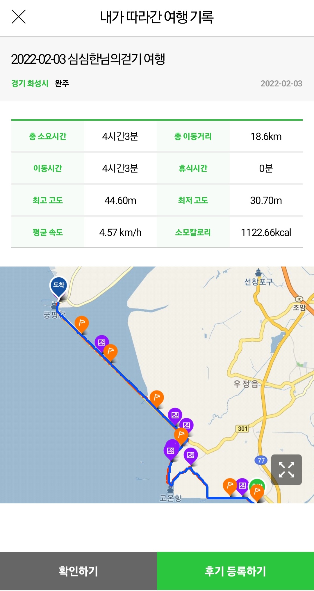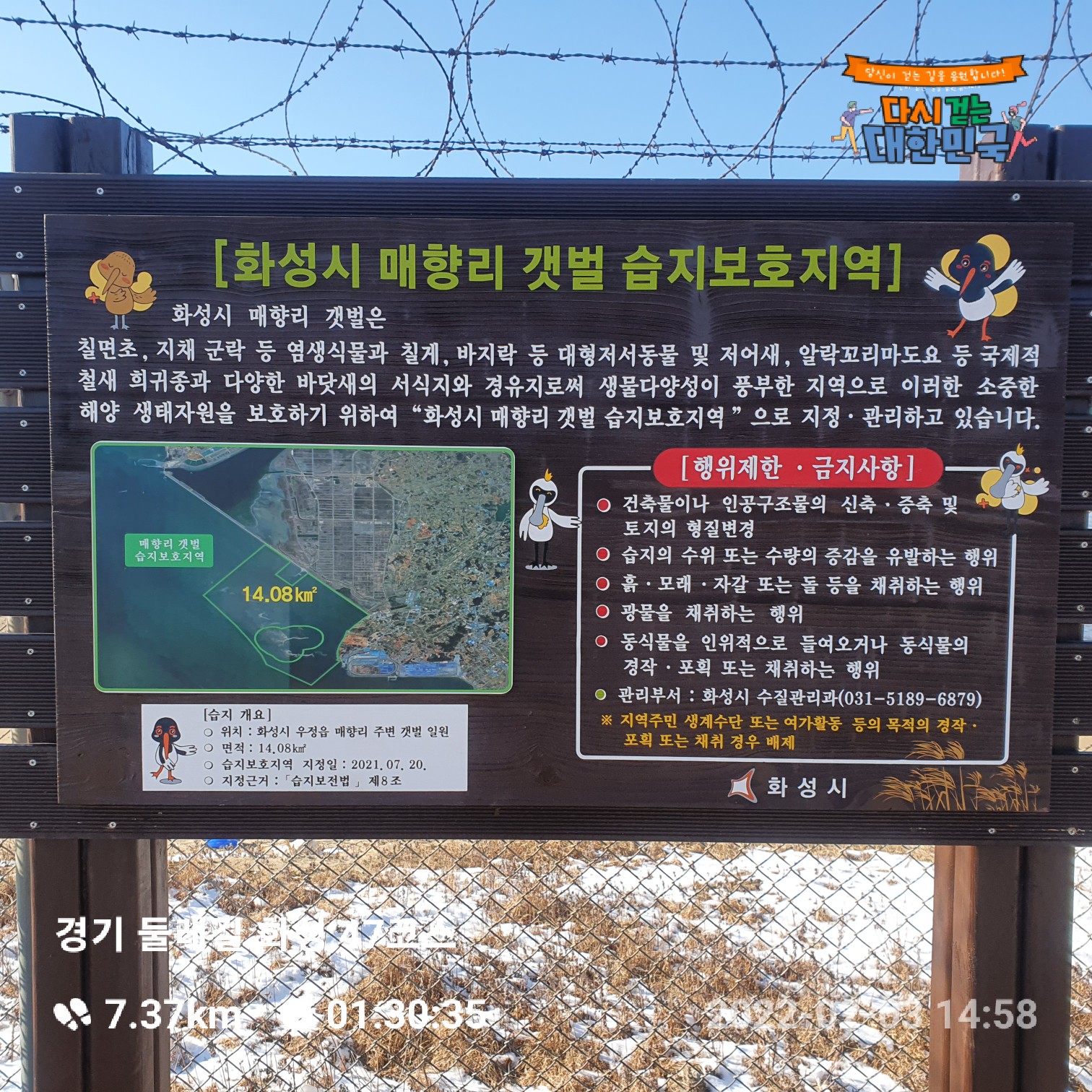 ▶ 주요 코스 : 화성이화리정류장 ~ 매향삼거리 ~ 매향리 선착장 ~ 화성방조제 ~ 궁평항