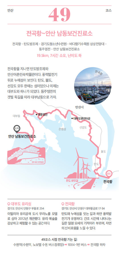 ▶ 주요 코스 : 전곡항 ~ 탄도방조제 ~ 경기도청소년수련원 ~ 바다향기수목원 상상전망대 ~ 동주염전 ~안산남동보건소
