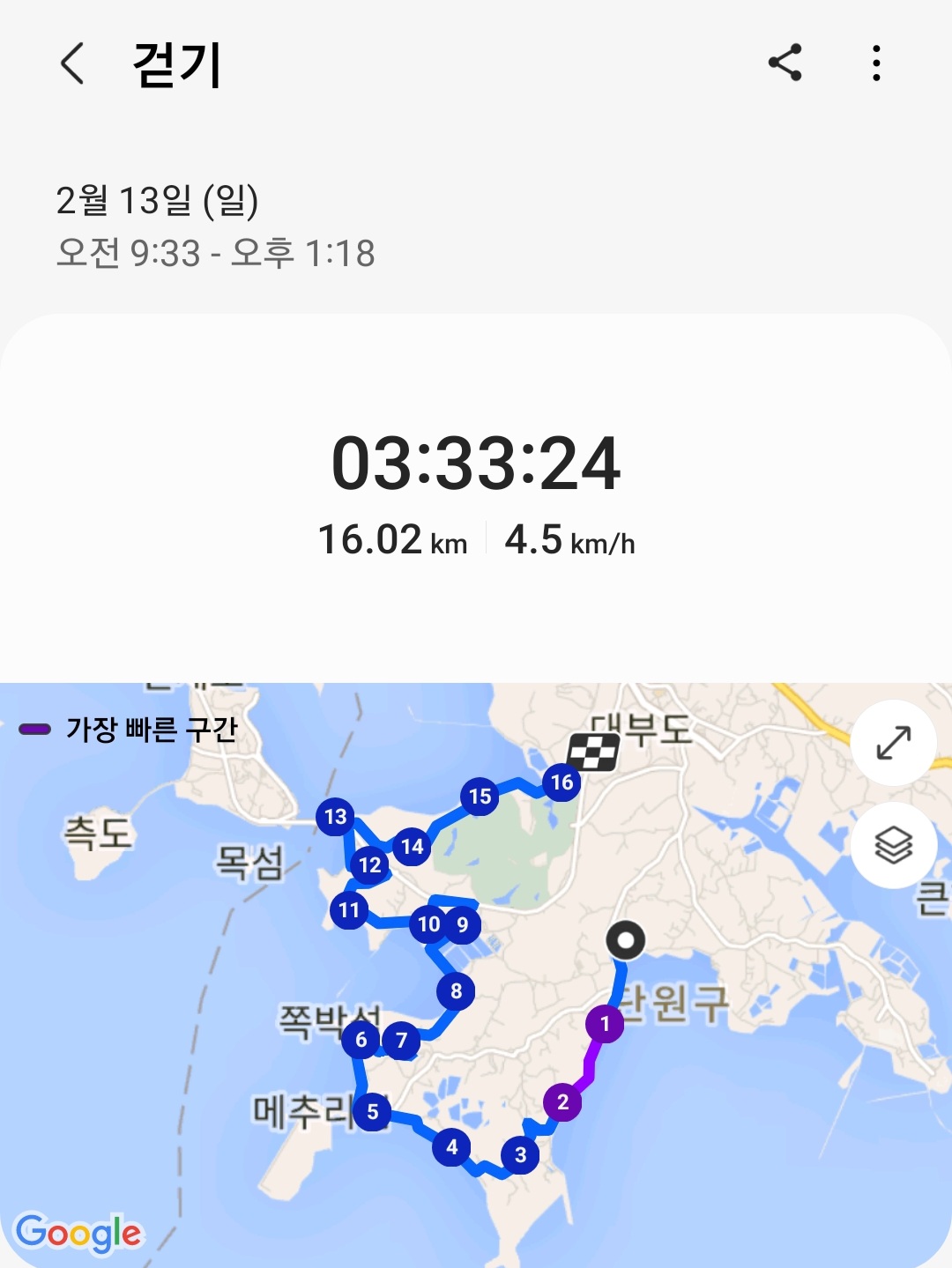 ▶ 실제 총거리 : 16.02km (갤럭시 워치4 기록)