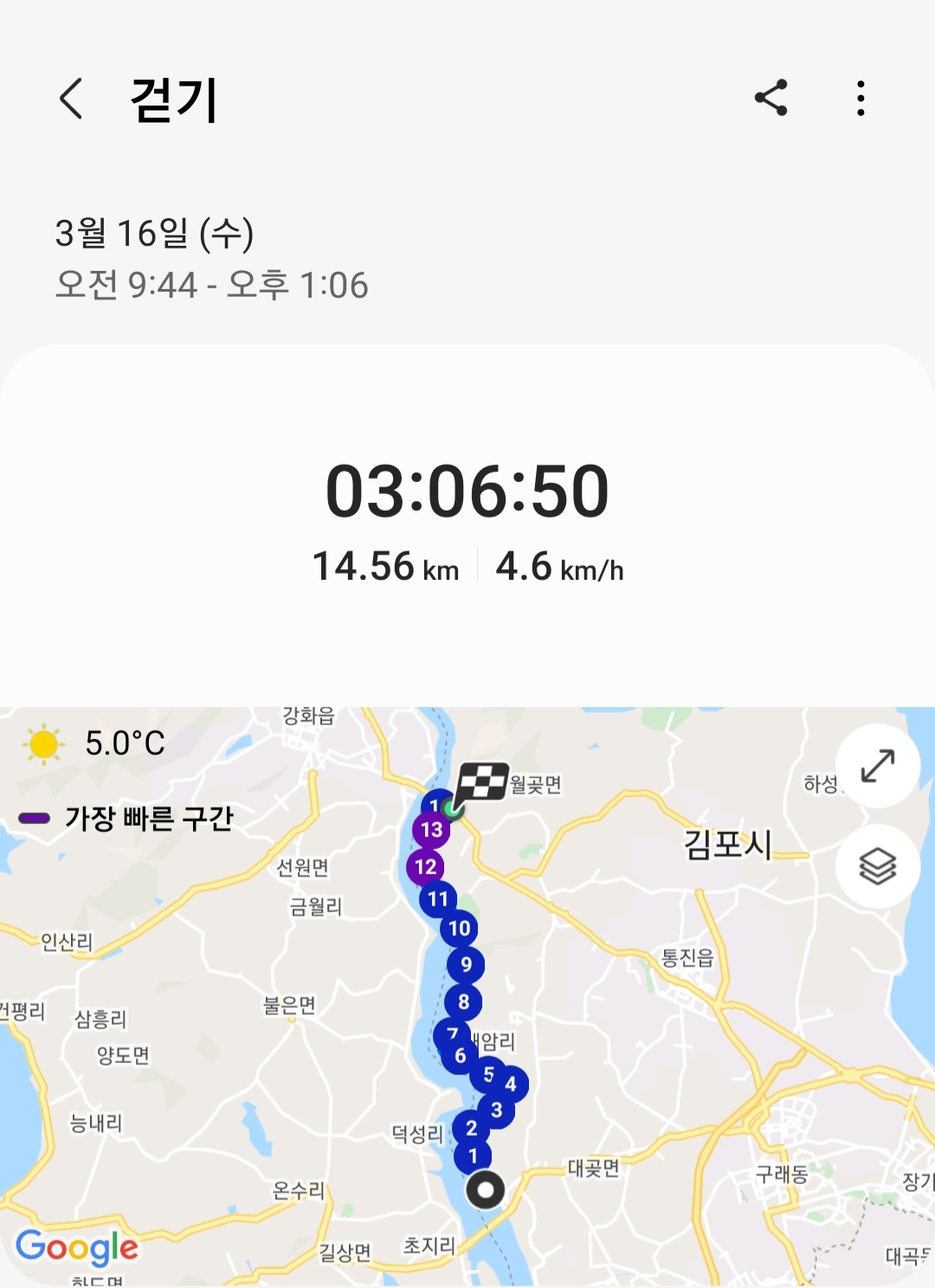▶ 실제 총거리 : 14.56km (갤럭시 워치4 기록)