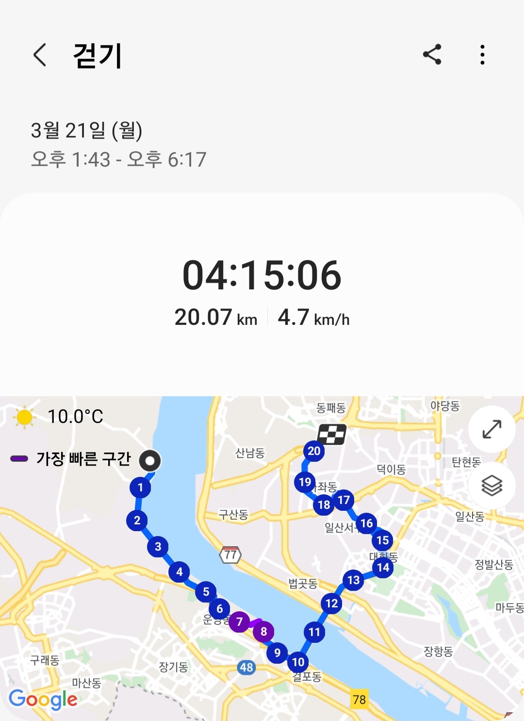 ▶ 실제 총거리 : 20.07km (갤럭시 워치4 기록)