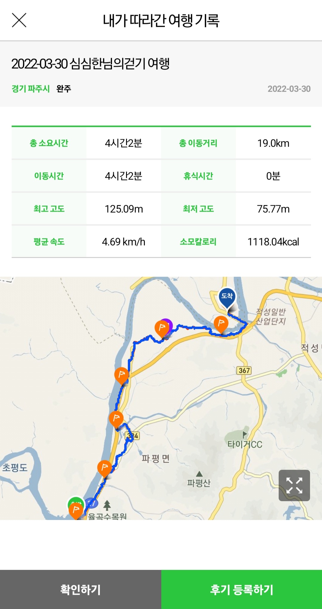 ▶ 주요 코스 : 율곡습지공원 ~ 파평면사무소 ~ 장파사거리 ~ 자장리마을회관 ~ 황포돛배나무터 ~ 장남교(원당리)